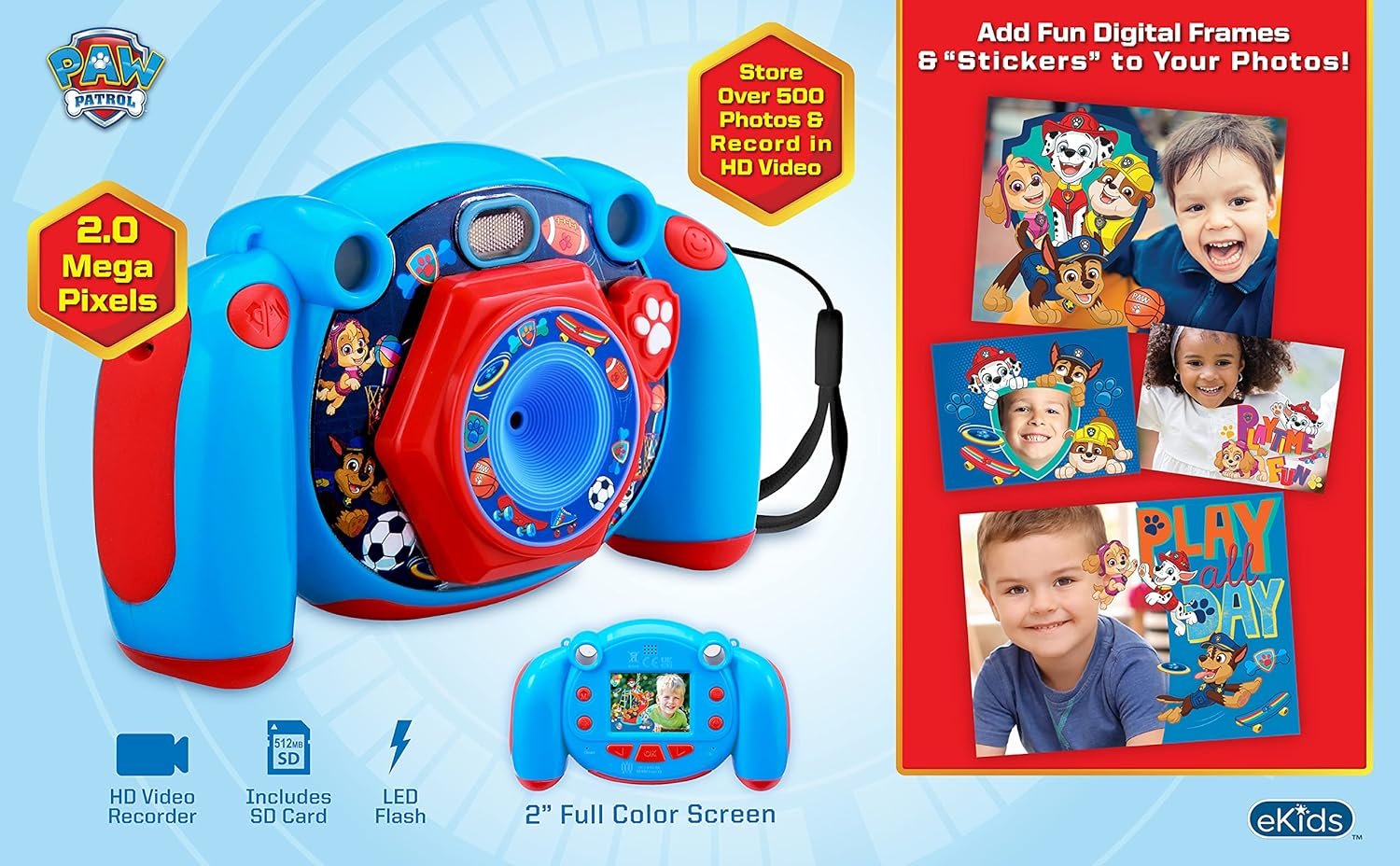 Τα παιδιά παίζουν και μαθαίνουν με την πρώτη τους φωτογραφική μηχανή Paw Patrol της eKids, η οποία έρχεται με official license από την Nickelodeon. Έχει σχεδιαστεί για τις ανάγκες των μικρών μας φωτογράφων, βγάζει φωτογραφίες και σας δίνει τη δυνατότητα να προσθέσετε stickers!