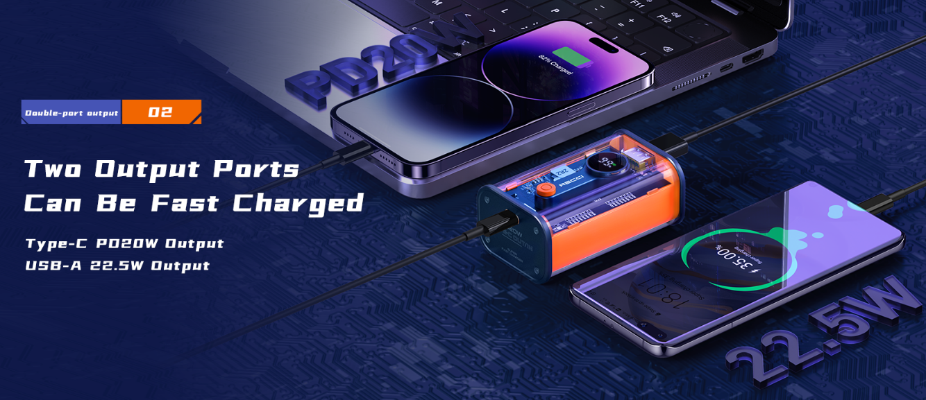 Σας προσφέρει επιλογές διπλής και γρήγορης φόρτισης, η θύρα Type-C υποστηρίζει γρήγορη φόρτιση 20W max και η θύρα USB-A υποστηρίζει 22.5W για φόρτιση των smartphone σας σε πλήρη ταχύτητα. Επιπλέον, διαθέτει μία θύρα εισόδου Type-C, για επαναφόρτιση του ίδιου του PowerBank.