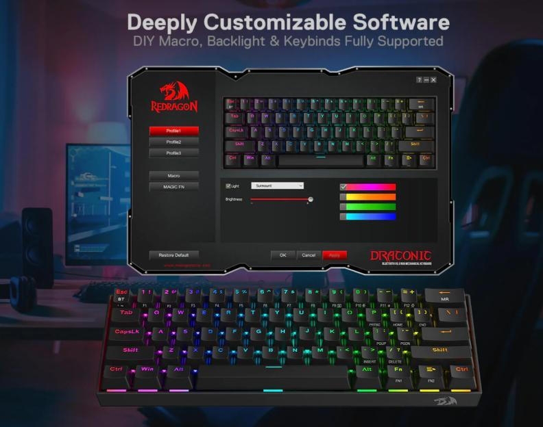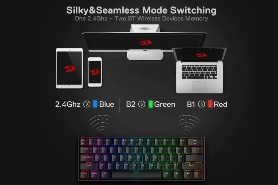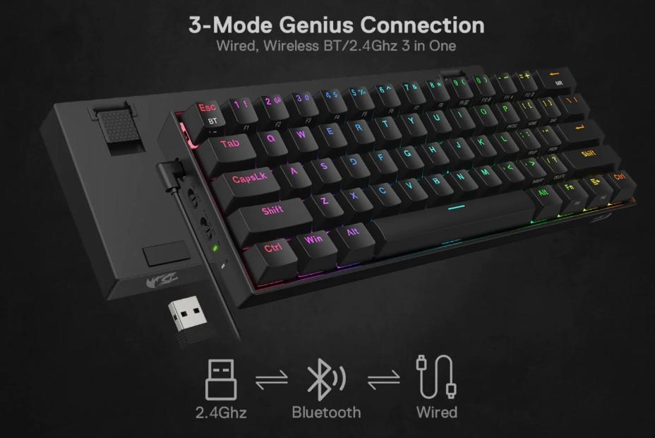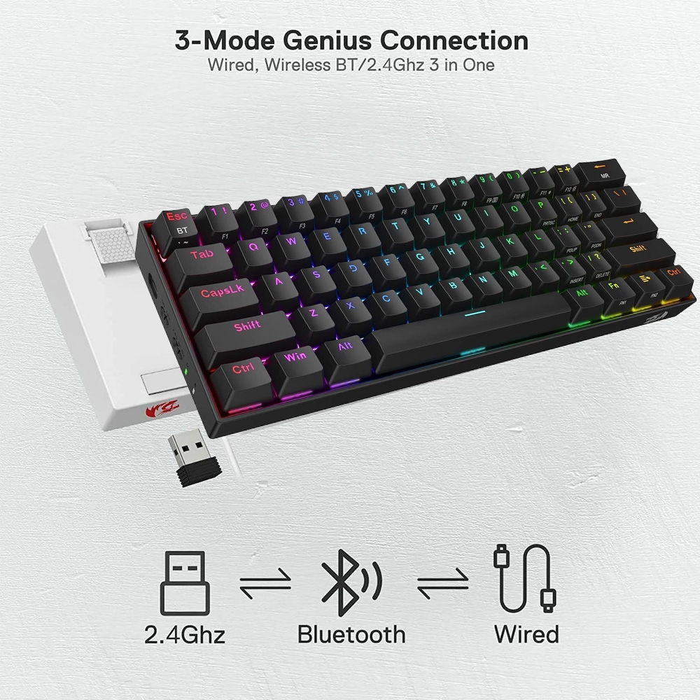 Είναι εξοπλισμένο με την πρωτοποριακή τεχνολογία σύνδεσης τριών λειτουργιών Redragon, ενσύρματο Type-C και τις ασύρματες λειτουργίες BT 3.0/5.0 & 2.4Ghz που κάνουν την εμπειρία χρήστη να αναβαθμίζεται σε άλλο επίπεδο σε όλους τους τομείς. Χρησιμοποιήστε το για να έχετε μια διαφορετική εμπειρία χρήστη και σας περιμένουν ατελείωτες πληκτρολογήσεις με οπίσθιο φωτισμό.