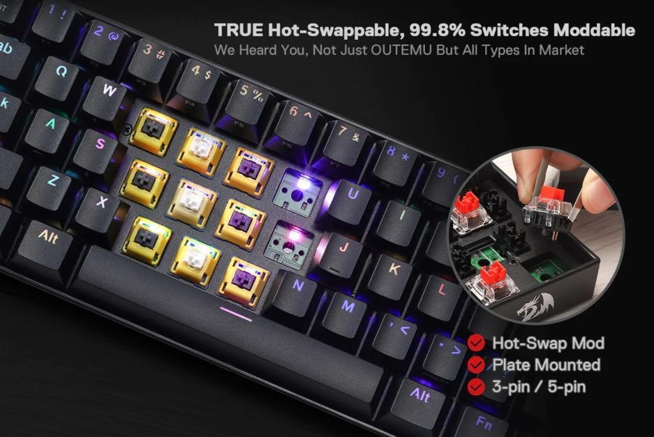 Διαθέτει καινοτομία με 99,8%+ διακόπτες συμβατούς με το πληκτρολόγιο Redragon και με δυνατότητα εναλλαγής. Ο μοναδικός αποκλειστικός σχεδιασμός του καθιστά την τοποθέτηση του διακόπτη ευκολότερη. Εναλλάσσεται με σχεδόν όλους τους τύπους διακοπτών της αγοράς, ανεξαρτήτως 3-pin ή 5-pin.