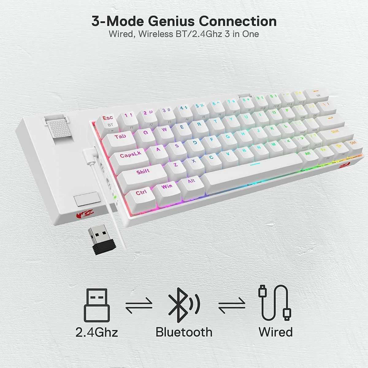Είναι εξοπλισμένο με την πρωτοποριακή τεχνολογία σύνδεσης τριών λειτουργιών Redragon, ενσύρματο Type-C και τις ασύρματες λειτουργίες BT 3.0/5.0 & 2.4Ghz που κάνουν την εμπειρία χρήστη να αναβαθμίζεται σε άλλο επίπεδο σε όλους τους τομείς. Χρησιμοποιήστε το για να έχετε μια διαφορετική εμπειρία χρήστη και σας περιμένουν ατελείωτες πληκτρολογήσεις με οπίσθιο φωτισμό.
