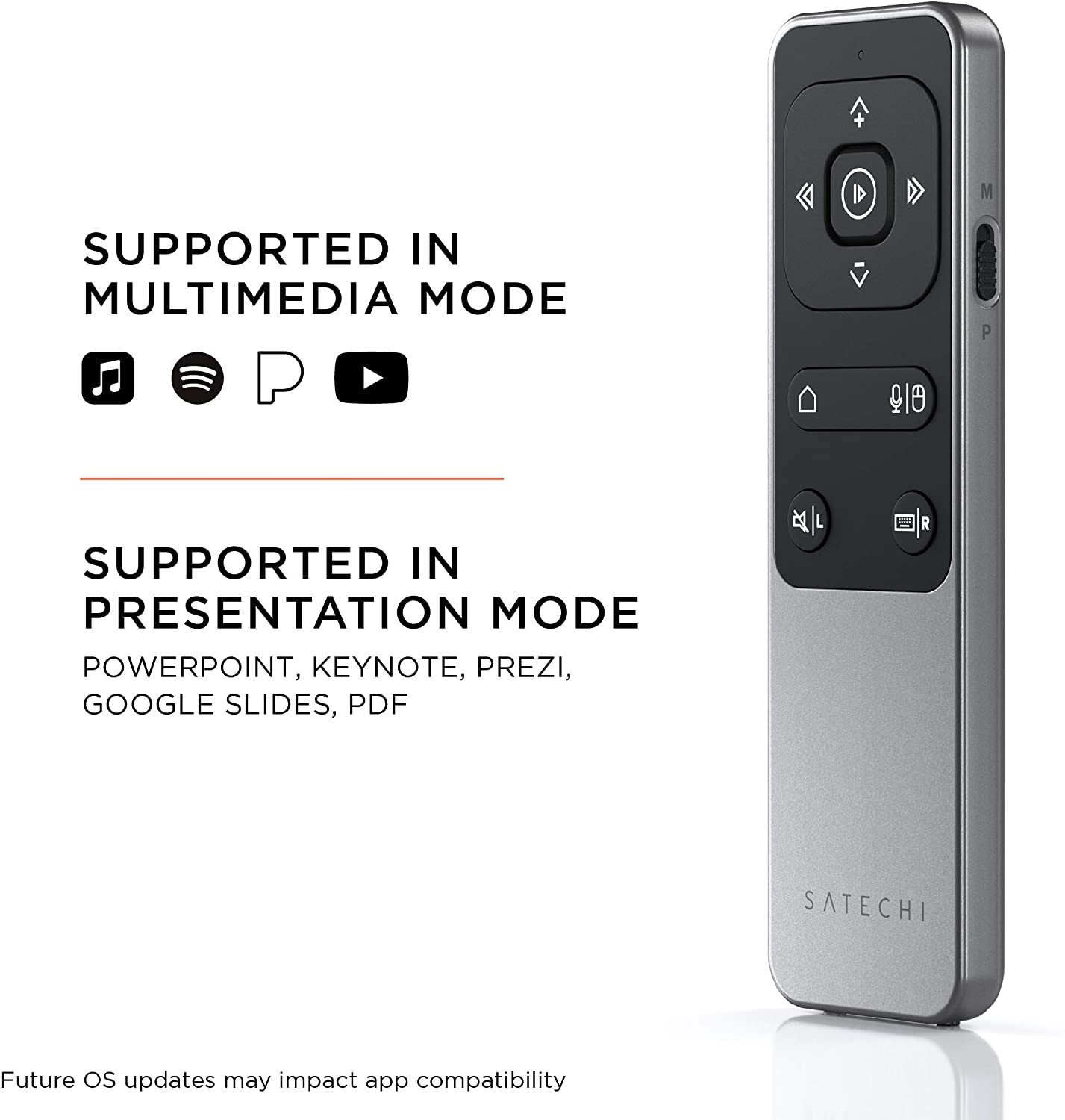 Υποστηρίζει: PowerPoint, Keynote, PDF, Google Slides και Prezi σε λειτουργία παρουσίασης. Apple Music, Spotify, Pandora, YouTube.