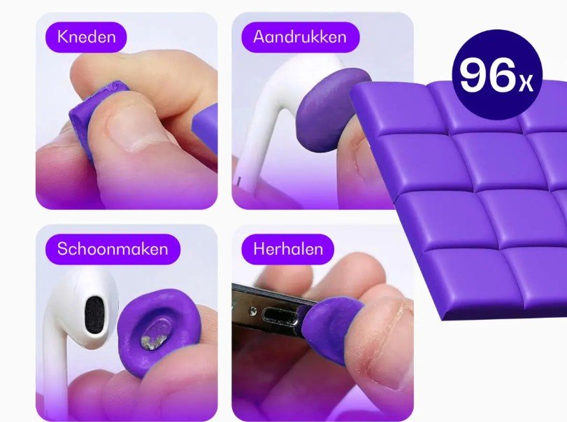 Το σετ περιλαμβάνει 96 πλακίδια πλαστελίνης, τα οποία είναι τέλεια για τις μικρές, δύσκολες γωνίες και απομακρύνει τη σκόνη, τα χνούδια και τις βρωμιές πολύ εύκολα. Εσείς απλά πλάστε, πιέστε και καθαρίσατε! Η βρωμιά μένει πάνω στην πλαστελίνη, αφήνοντας τις επιφάνειες σας πεντακάθαρες.