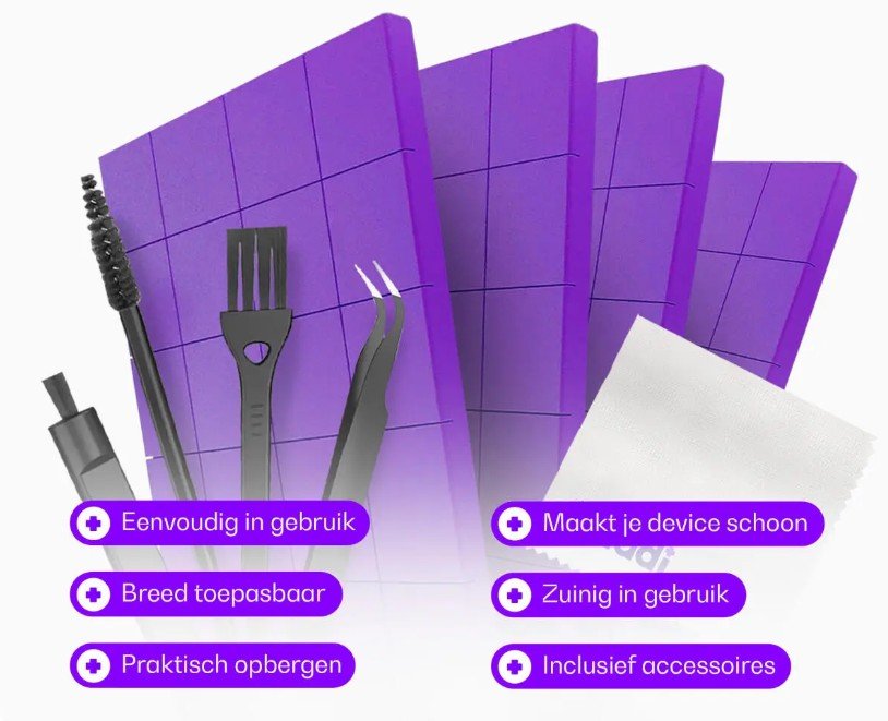 Αυτό το πολυλειτουργικό σετ, είναι σχεδιασμένο ειδικά για smartphones, tablets, laptops, φωτογραφικές μηχανές, πληκτρολόγια, ακουστικά και κάθε ηλεκτρονική συσκευή, αξεσουάρ και gadget. Περιλαμβάνει εργαλεία που εξασφαλίζουν έναν βαθύ καθαρισμό ακόμα και στα πιο δυσπρόσιτα σημεία, αφαιρώντας σκόνη, βρομιά και δακτυλικά αποτυπώματα.