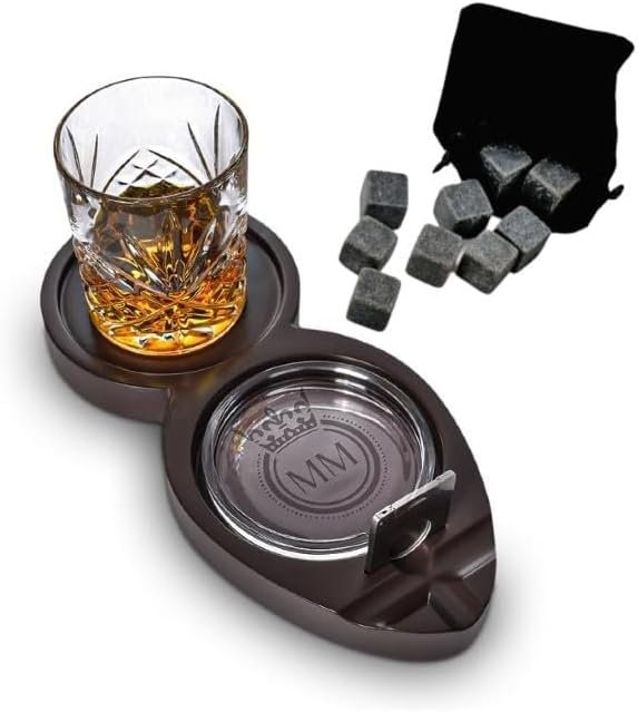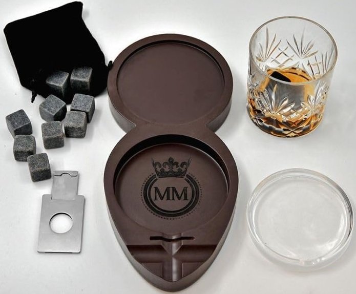 Περιλαμβάνει ένα πολυτελές ξύλινο δίσκο, ένα κομψό ποτήρι ουίσκι, ιδανικό για να αναδείξετε τα αρώματα του αγαπημένου σας ποτού, ένα τασάκι, ειδικά σχεδιασμένο για να απολαμβάνετε το πούρο σας, έναν κόφτη πούρων, για απόλυτη ακρίβεια στο κόψιμο και 9 πέτρες ουίσκι, για να διατηρείτε το ουίσκι σας δροσερό.
