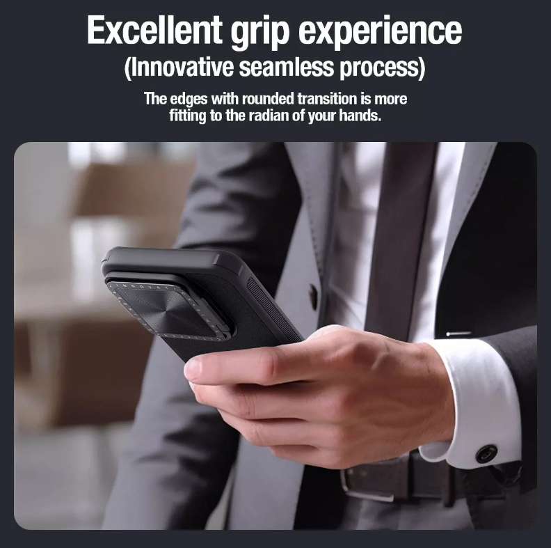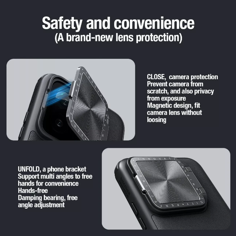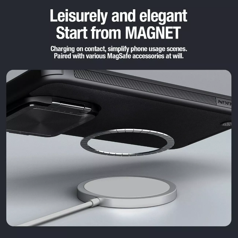 Διαθέτει ένα μαγνητικό μεταλλικό κάλυμμα στην κάμερα, το οποίο προστατεύει την κάμερα του τηλεφώνου σας από γρατσουνιές και βλάβες, ενώ λειτουργεί επίσης ως βάση, προσφέροντας ευκολία στη χρήση για παρακολούθηση ταινιών ή βιντεοδιασκέψεις. Η θήκη υποστηρίζει τη λειτουργία MagSafe, επιτρέποντάς σας να απολαύσετε την ασύρματη φόρτιση και την εύκολη χρήση με τα MagSafe αξεσουάρ.