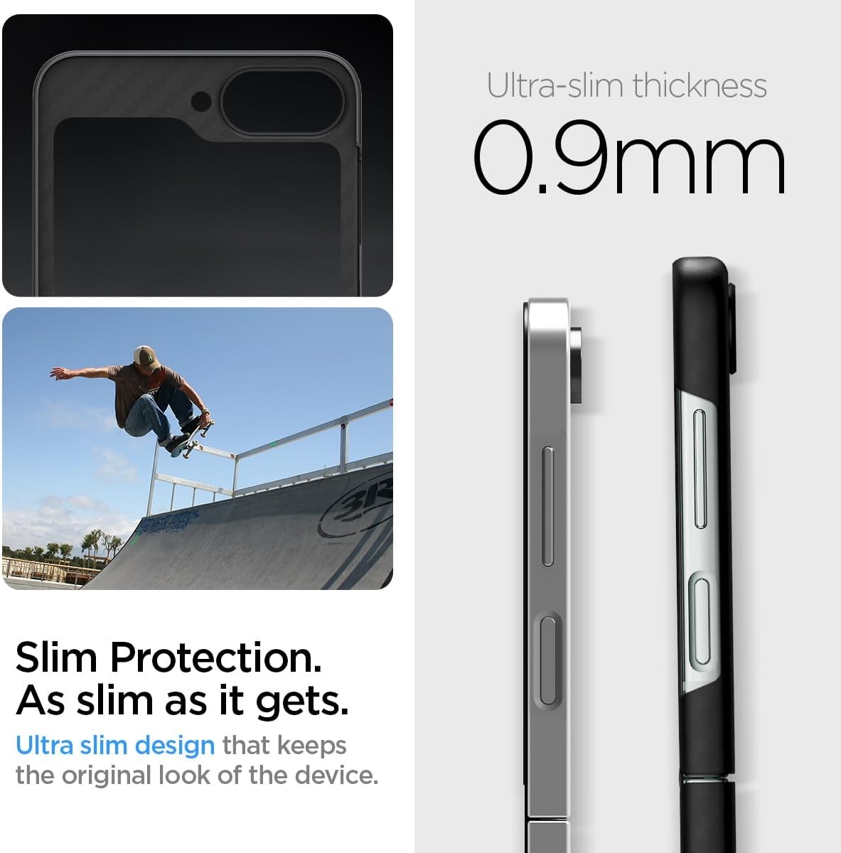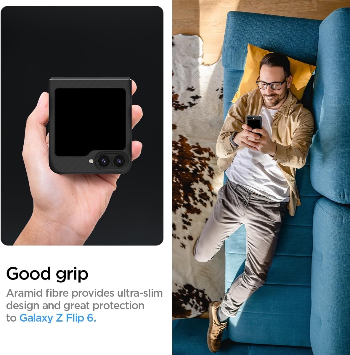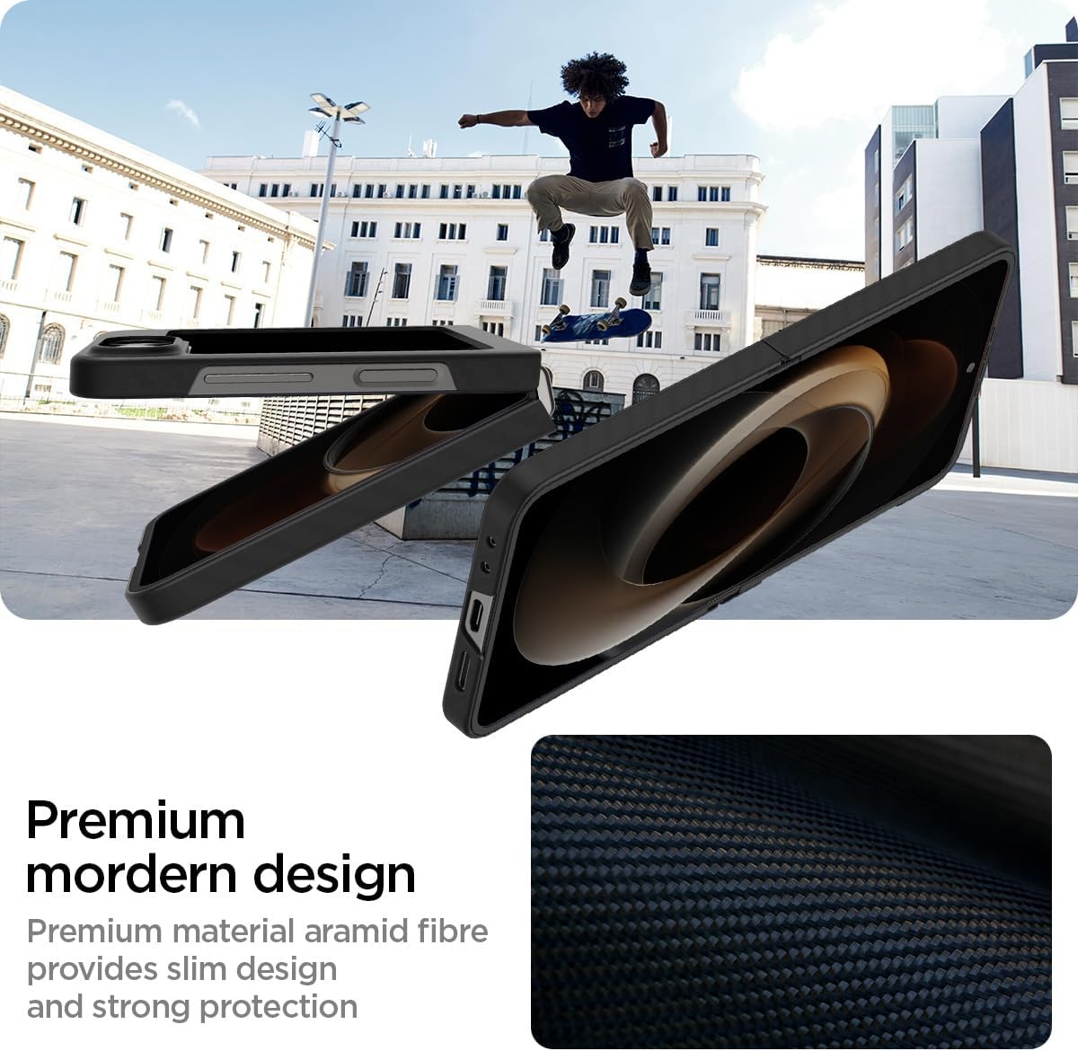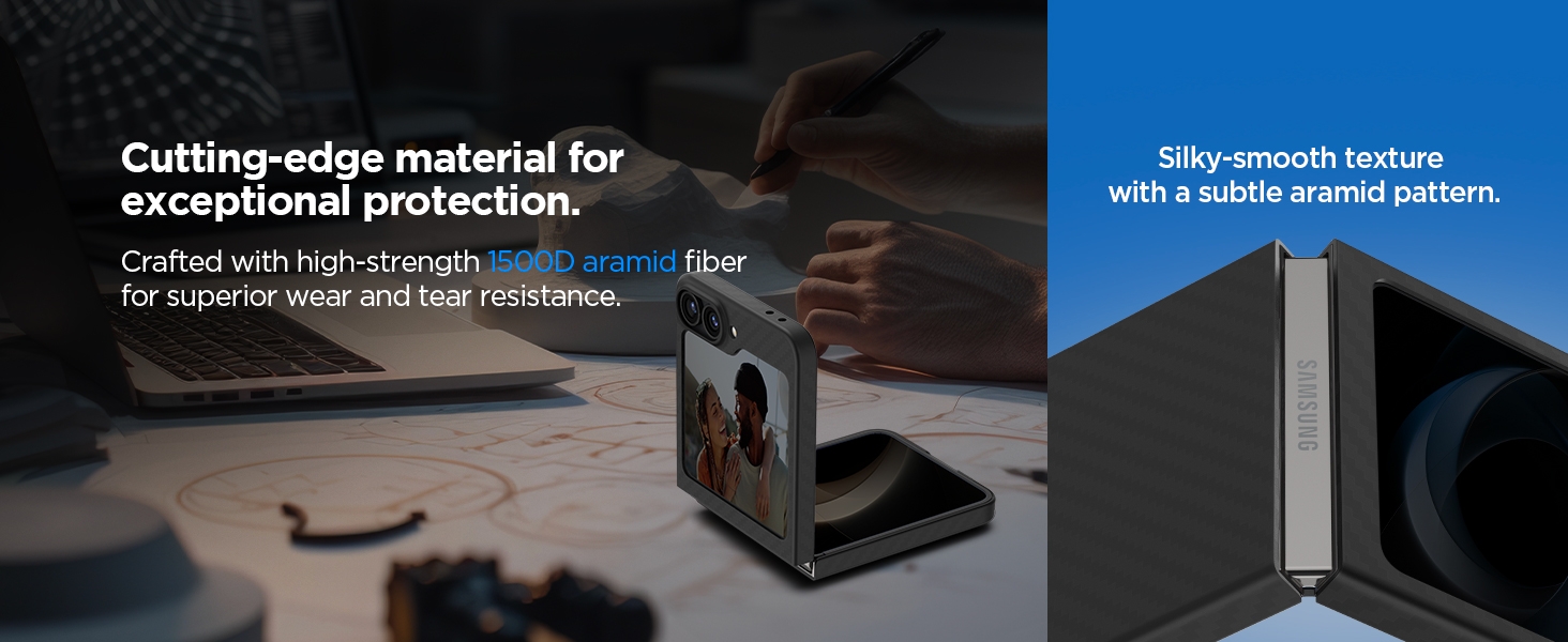 Η θήκη Air Skin Aramid της Spigen είναι η πιο λεπτή θήκη που έχει σχεδιαστεί ποτέ για το Samsung Galaxy Z Flip7 FE / Z Flip6. Σας εξασφαλίζει ελεύθερη πρόσβαση στα βασικά πλήκτρα, τις θύρες διασύνδεσης, την οθόνη και την πίσω κάμερα. Είναι εξαιρετικά ελαφριά, προσφέρει εξαιρετική αντοχή και προστατεύει από δακτυλικά αποτυπώματα, γρατζουνιές, φθορές, πτώσεις ή χτυπήματα.