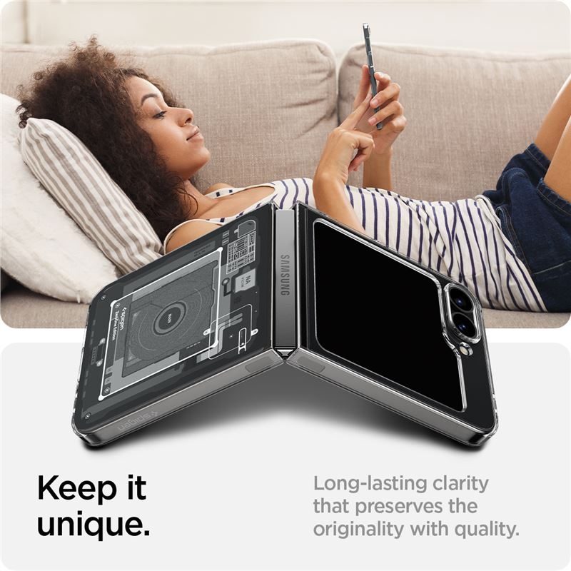 Η Air Skin της Spigen είναι η πιο λεπτή θήκη που έχει κατασκευαστεί ποτέ για το Samsung Galaxy Z Flip7 FE / Z Flip6. Σας εξασφαλίζει ελεύθερη πρόσβαση στα βασικά πλήκτρα, τις θύρες διασύνδεσης, την οθόνη και την πίσω κάμερα.