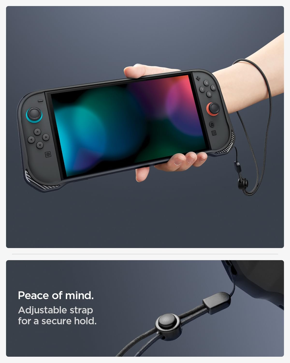Η θήκη Rugged Armor της Spigen είναι κατασκευασμένη για να εφαρμόζει τέλεια στο Nintendo Switch 2 και να το προστατεύει από την καθημερινή χρήση αποτελεσματικά, χωρίς να προσθέτει επιπλέον όγκο στη συσκευή σας. Επιπλέον, διαθέτει και ένα λουράκι χειρός για ευκολία και ασφάλεια στο κράτημα.
