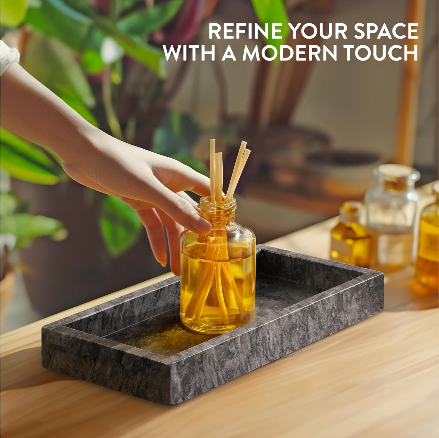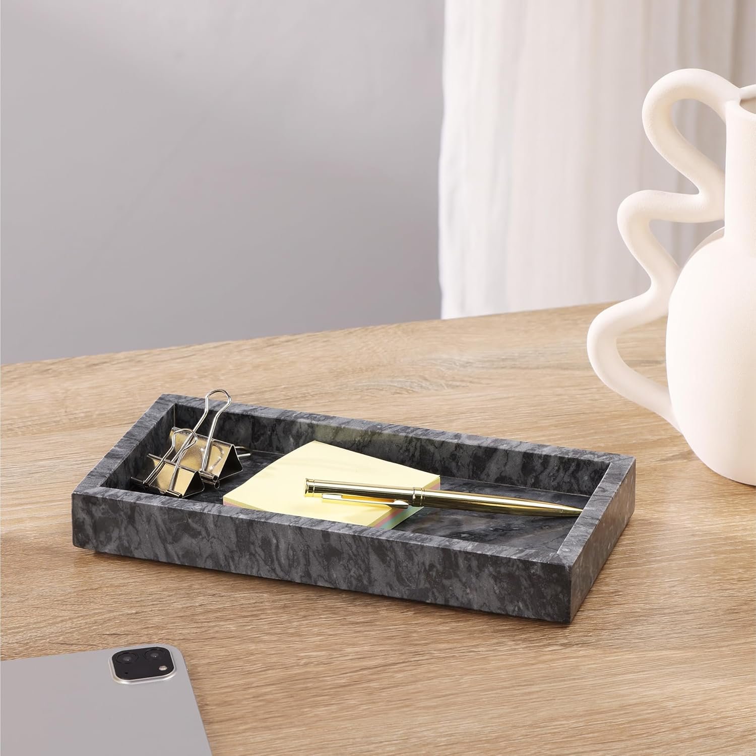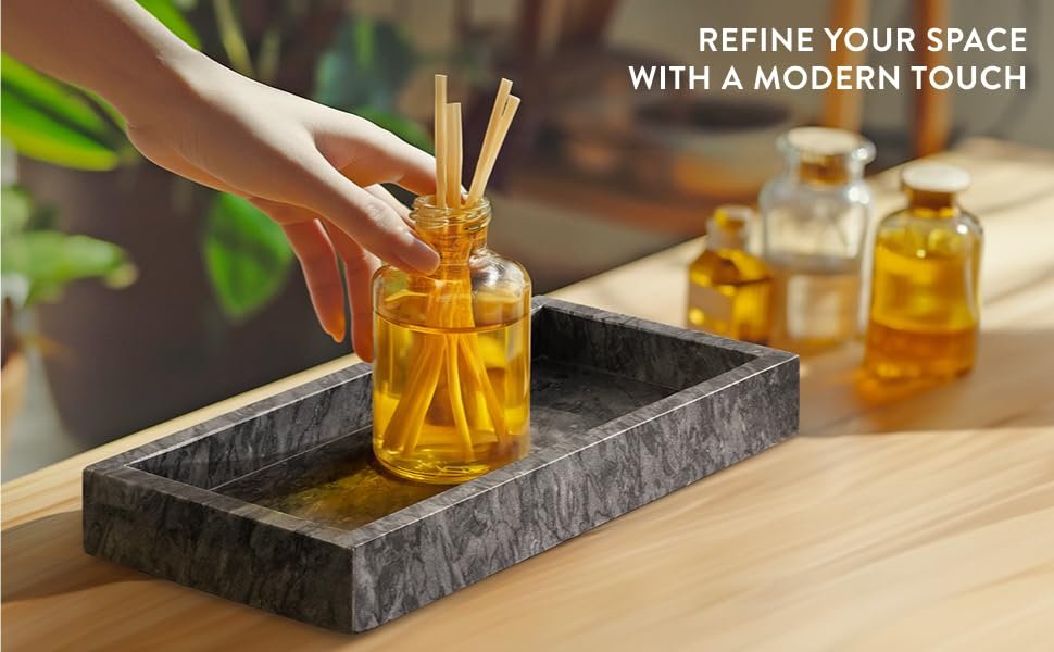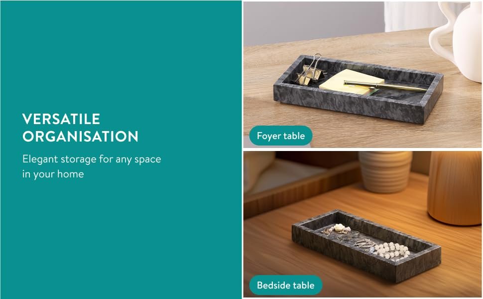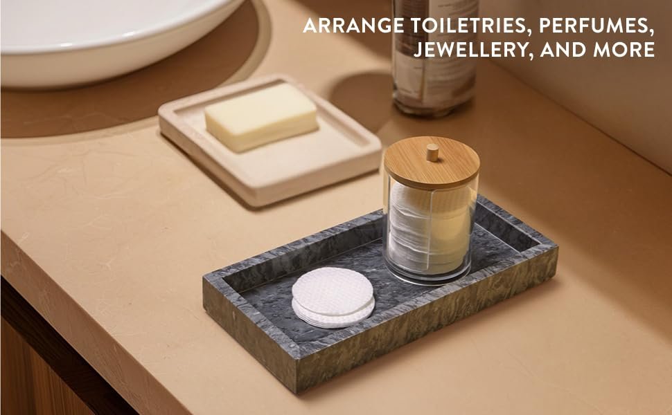 Η μοναδική υφή και οι γήινες αποχρώσεις της μαρμάρου δημιουργούν ένα πολυτελές και ταυτόχρονα διακριτικό διακοσμητικό στοιχείο. Μπορεί να χρησιμοποιηθεί για να οργανώσετε και να αναδείξετε τα αγαπημένα σας κοσμήματα, μπουκάλια αρωμάτων ή απαραίτητα αξεσουάρ μπάνιου. Είναι ιδανικός για το μπουντουάρ, αλλά και για κάθε άλλο χώρο που χρειάζεται οργάνωση με στυλ.