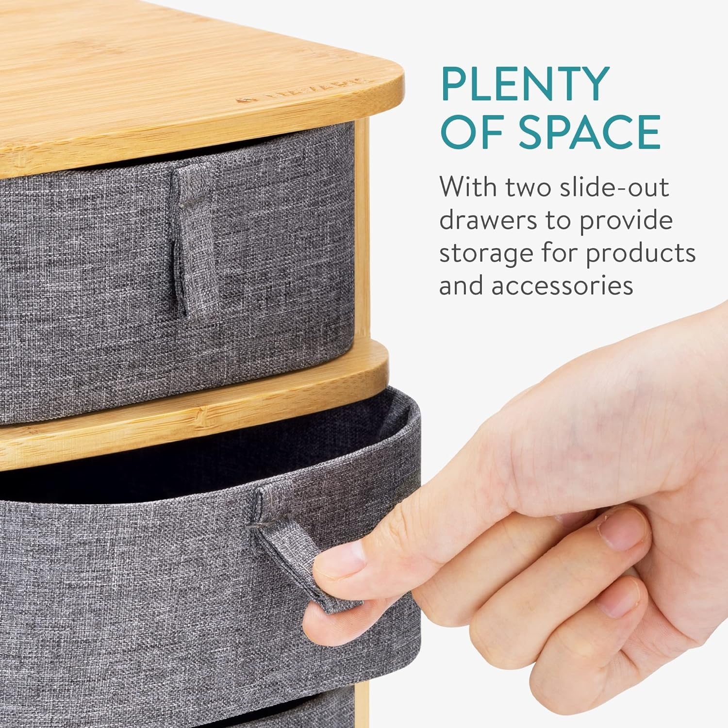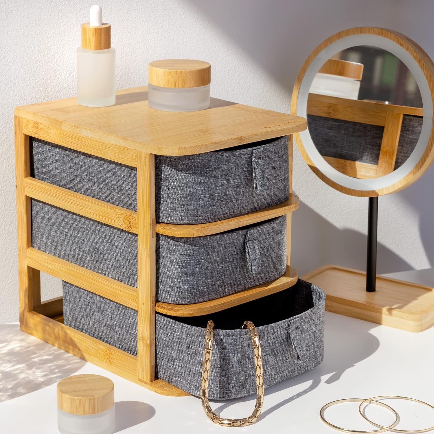 Με τα πρακτικά 3 συρτάρια θα μπορείτε να οργανώστε όλα τα προϊόντα περιποίησής σας, από μακιγιάζ, κρέμες και προϊόντα μαλλιών. Ακόμη και τα μεγαλύτερα αντικείμενα μπορούν να αποθηκευτούν στην επάνω στιβαρή επιφάνεια από μπαμπού, παρέχοντας ένα πρακτικό χώρο για εύκολη πρόσβαση και οργάνωση.