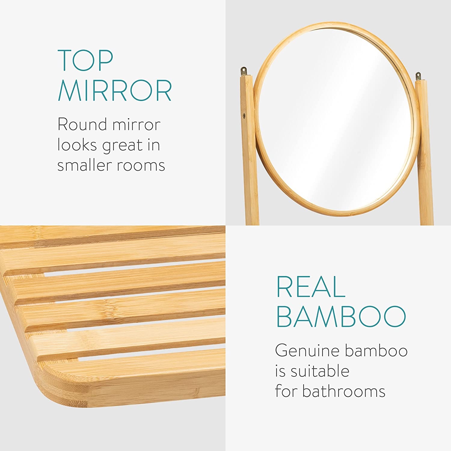 Η συσκευασία περιλαμβάνει: 1 x Βάση μπαμπού με καθρέφτη, 1 x Ράφι, 1 x Καλάθι.