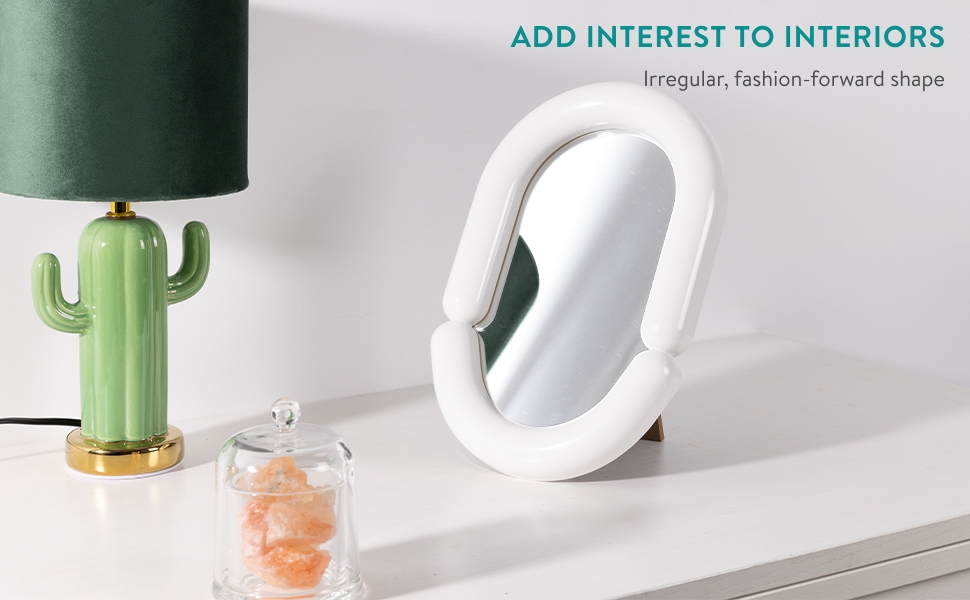 Ο πολυμορφικός σχεδιασμός του σας επιτρέπει να τον τοποθετείται είτε κρεμαστό στον τοίχο, είτε επιτραπέζια, παρέχοντας ευελιξία στη χρήση. Η ακανόνιστη μορφή του προσθέτει ενδιαφέρον στους εσωτερικούς χώρους, ενώ το υψηλής ποιότητας γυαλί του εξασφαλίζει την καθαρή και ακριβή αντανάκλαση.