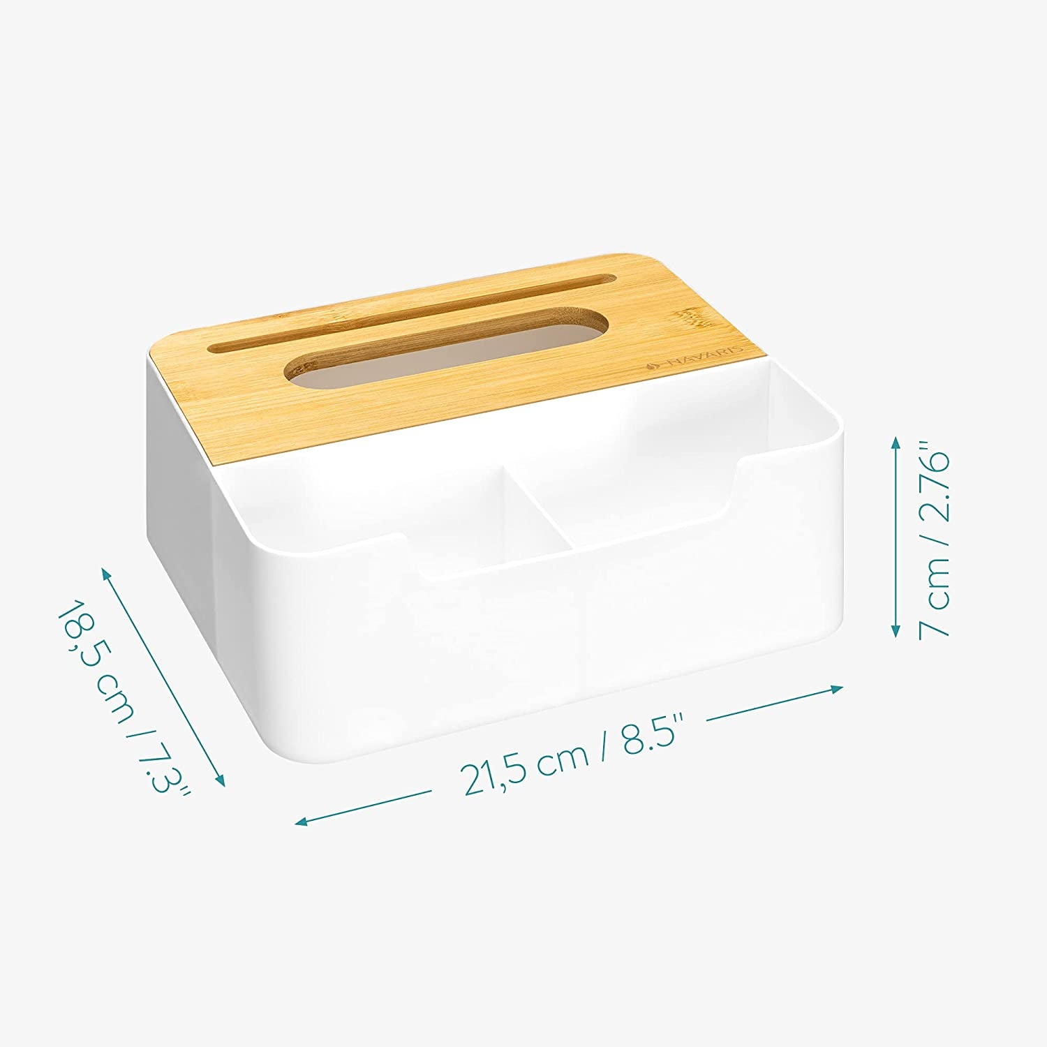 Αυτό το μοναδικό κουτί για χαρτοπετσέτες είναι κατασκευασμένο από μπαμπού και πλαστικό και διαθέτει μία υποδοχή για το κινητό σας τηλέφωνο, δύο μεγαλύτερους χώρους αποθήκευσης για άλλα αντικείμενα όπως τα καλλυντικά σας, στυλό, τηλεχειριστήριο τηλεόρασης, κλειδιά, γυαλιά και άλλα.