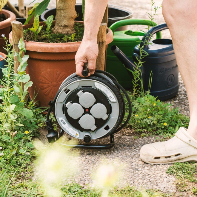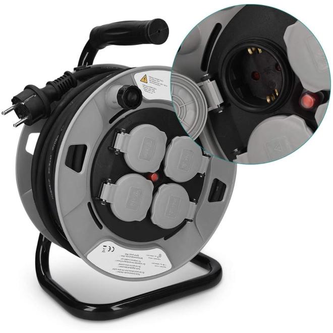 Τα καπάκια των 4 υποδοχών κλείνουν μόνα τους όταν δεν χρησιμοποιούνται. Χάρη στις συμπαγείς διαστάσεις, ο κύλινδρος καλωδίου μπορεί επίσης να αποθηκευτεί εύκολα όταν δεν χρησιμοποιείται, ενώ το καλώδιο τυλίγεται εύκολα με μανιβέλα.