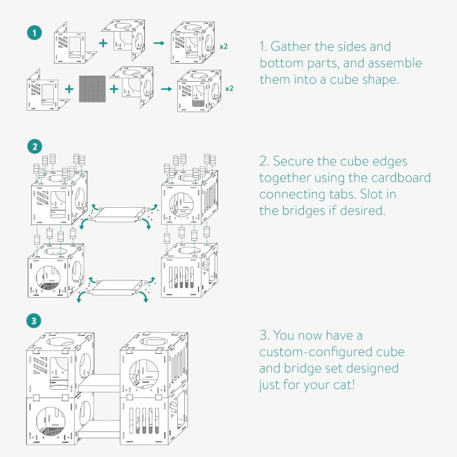 Η συναρμολόγηση είναι σχετικά εύκολη καθώς το σετ περιλαμβάνει όλα τα εξαρτήματα σύνδεσης που απαιτούνται για την ολοκλήρωσή του. Κάθε κύβος έχει διαστάσεις 30,5 x 30,5 x 30,5 cm, οπότε χάρη στις διαστάσεις, το αποτέλεσμα θα είναι εντυπωσιακό. Επίσης, μέσα σε 2 κύβους μπορείτε να τοποθετήσετε τα ονυχοδρόμια που περιλαμβάνονται, ώστε η γατούλα σας να απολαύσει το ακόνισμα των νυχιών της.