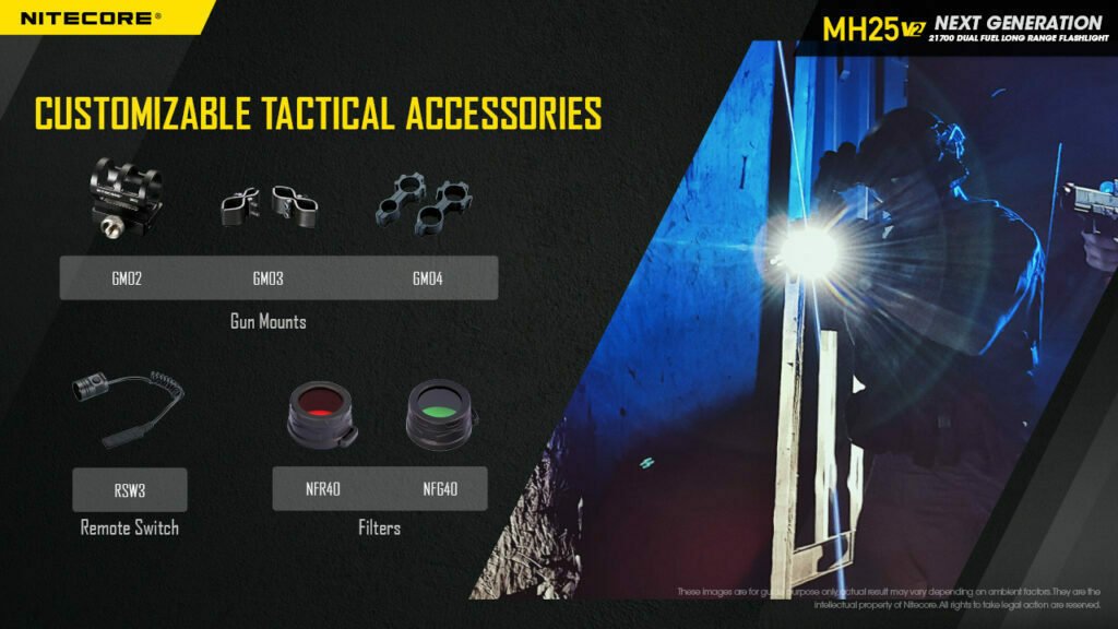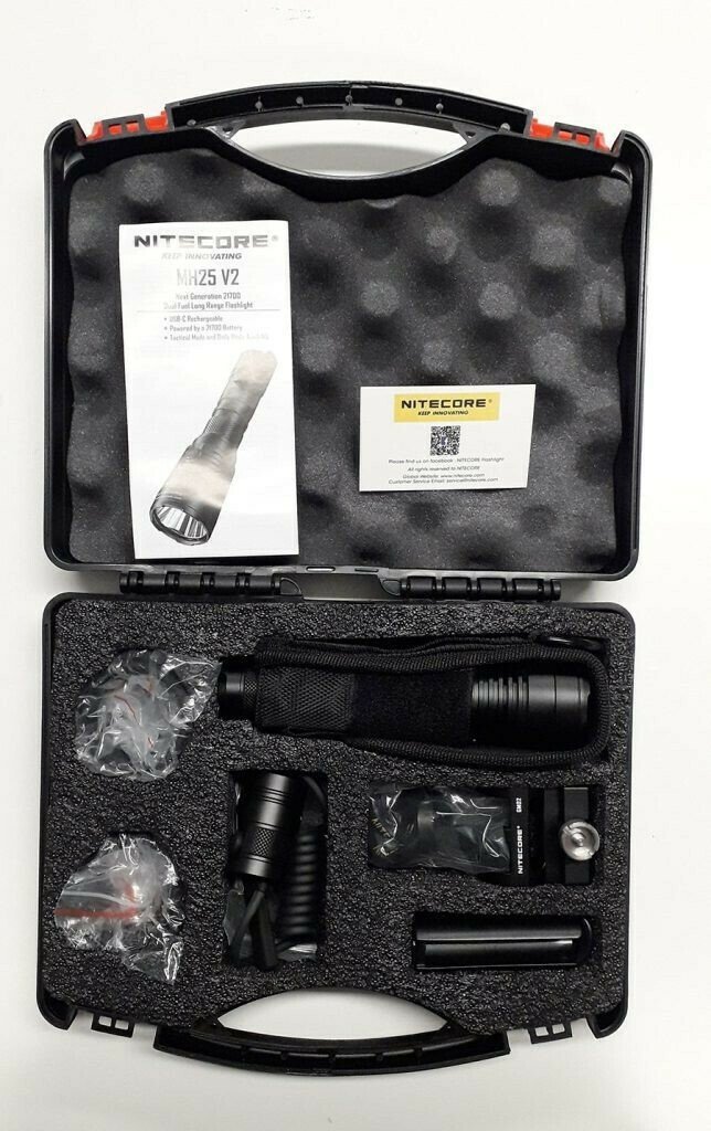 Η συσκευασία περιλαμβάνει: 1 x Φακός MH25V2, 1 x Μπαταρία επαναφορτιζόμενη NL2150, 1 x Διακόπτης απομακρυσμένου ελέγχου RSW3, 1 x Βάση στήριξης GM02 weaver, 1 x Φίλτρο κόκκινο NFR40, 1 x Φίλτρο πράσινο NFG40, 1 x Θήκη ζώνης από συνθετικό ύφασμα cordura, 1 x Αντάπτορας για χρήση μπαταριών 18650, CR123, 1 x Καλώδιο φόρτισης Type-C, 1 x Ατσάλινο κλιπ συγκράτησης, 1 x Λουράκι καρπού, 1 x Κλειδί Alen, 1 x Ανταλλακτικός ελαστικός δακτύλιος “Ο”.