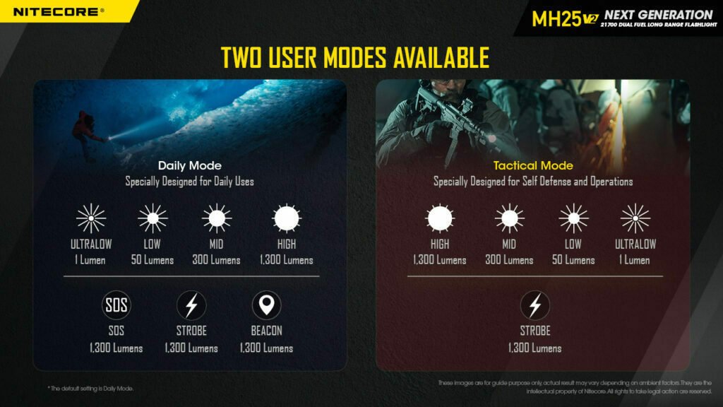 Έχει δύο διαθέσιμες λειτουργίες, την καθημερινή λειτουργία ειδικά σχεδιασμένη για την καθημερινή χρήση και την τακτική λειτουργία, ειδικά σχεδιασμένη για αυτοάμυνα και επιχειρήσεις. Περιλαμβάνει μία επαναφορτιζόμενη μπαταρία NL2150, 21700 – 5000mAh με μέγιστο χρόνο λειτουργίας έως 1500 ώρες στο ultra-low mode. Με το σύστημα Strobe με τυχαία εναλλασσόμενη συχνότητα, μπορείτε να δημιουργήσετε σύγχυση σε τακτικές καταστάσεις.