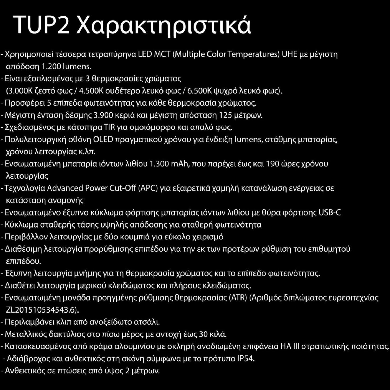 Η συσκευασία περιλαμβάνει: 1 x Φακός TUP2 MCT, 1 x Kρίκος κλειδιών, 1 x Καλώδιο φόρτισης USB-A σε Type-C.