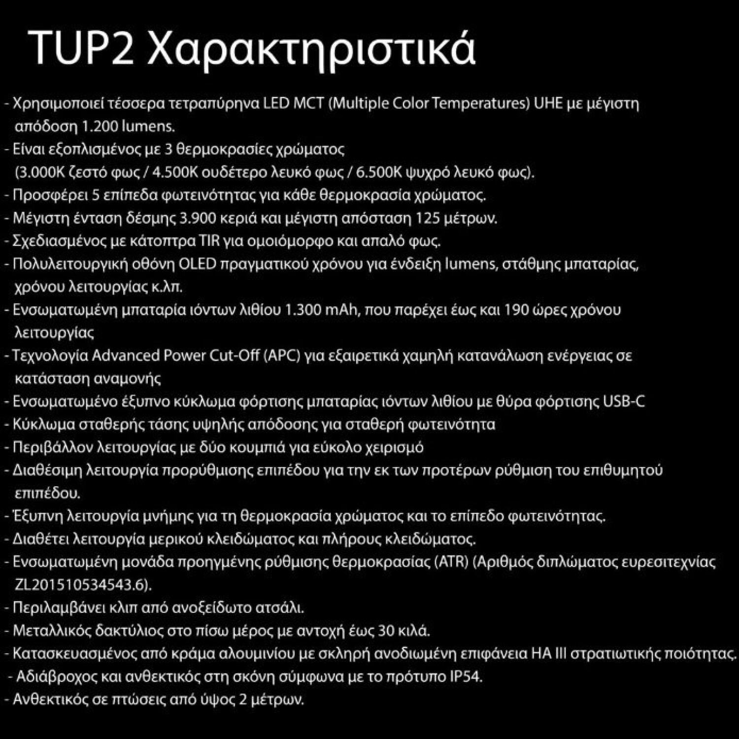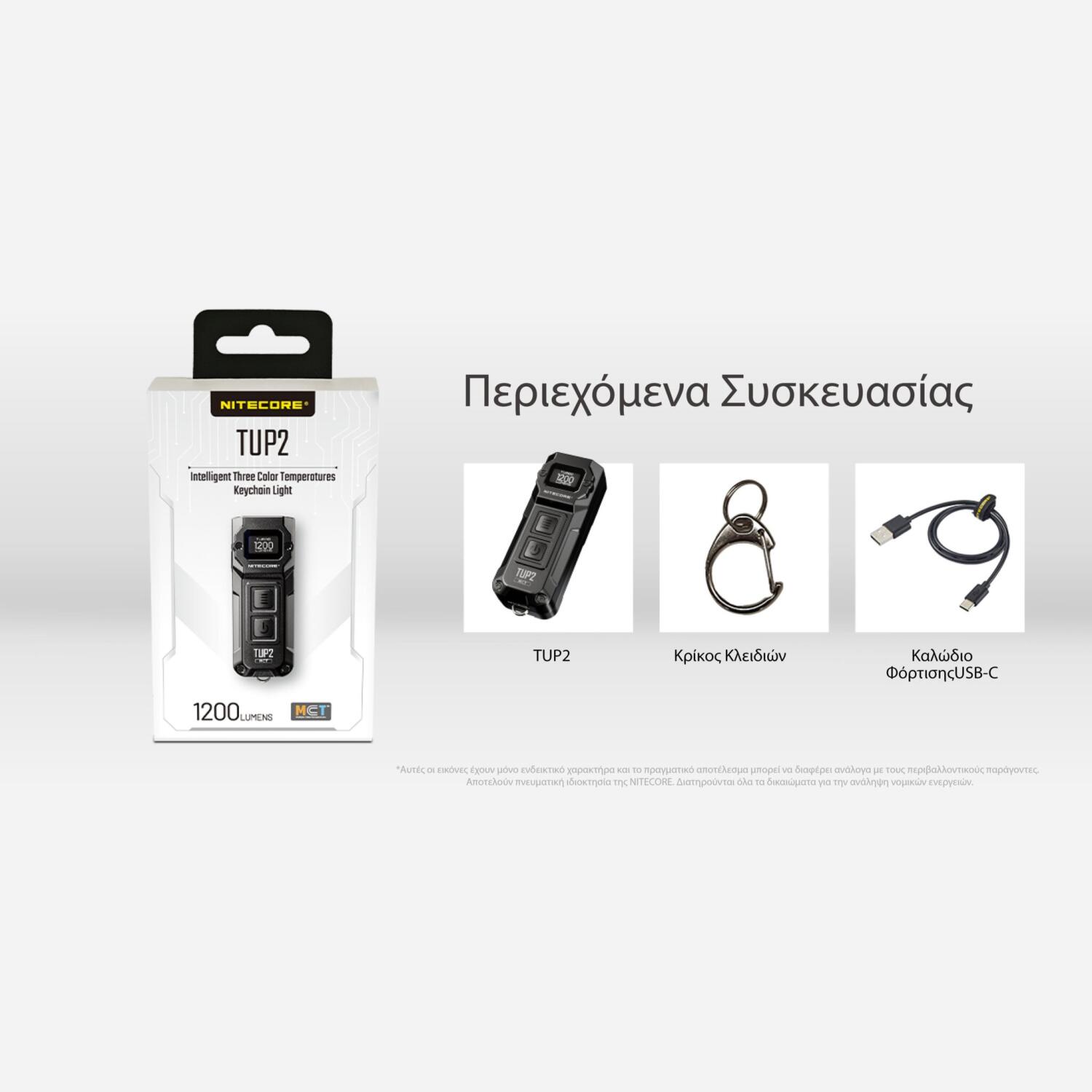 Η συσκευασία περιλαμβάνει: 1 x Φακός TUP2 MCT, 1 x Kρίκος κλειδιών, 1 x Καλώδιο φόρτισης USB-A σε Type-C.