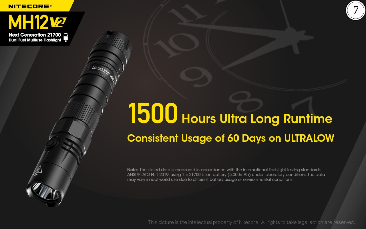 Η διάρκεια λειτουργίας του στην πιο χαμηλή ένταση μπορεί να φθάσει και τις 1500 ώρες που σημαίνει συνεχόμενη χρήση στην πιο χαμηλή ένταση για 60 ημέρες! Ο οπίσθιος διακόπτης στο καπάκι ουράς είναι σχεδιασμένος για επιχειρησιακή χρήση. Πάντα έτοιμος τόσο για στιγμιαίο φωτισμό όσο και για τον μόνιμο φωτισμό.