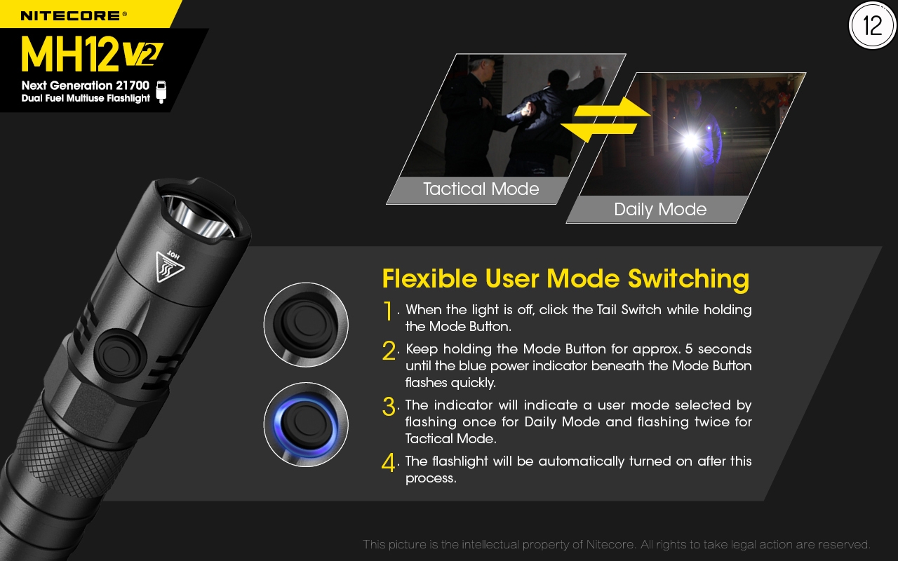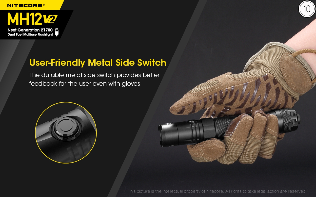 Ο φιλικός προς τον χρήστη πλάγιος μεταλλικός διακόπτης είναι ανθεκτικός και παρέχει καλύτερη ανταπόκριση στον χρήστη ακόμη και όταν φοράτε γάντια. Διαθέτει δύο τρόπους λειτουργίας, τον "Καθημερινό τρόπο λειτουργίας" και τον "Επιχειρησιακό τρόπο λειτουργίας". Στον καθημερινό τρόπο λειτουργίας οι διαθέσιμες φωτεινότητες είναι οι, High, Mid, Low, Ultralow, Strobe, Beacon, SOS. Στον επιχειρησιακό τρόπο λειτουργίας οι διαθέσιμες φωτεινότητες είναι οι, High, Mid, Low, Ultralow, Strobe. Ο προεπιλεγμένος τρόπος λειτουργίας είναι ο καθημερινός.