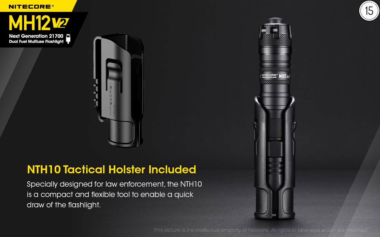 Στην συσκευασία περιλαμβάνεται μία επιχειρησιακή σκληρή θήκη μεταφοράς NTH10 με ικανότητα προσαρμογής σε διάφορα πάχη ζωνών. Συνοδεύεται επίσης από ένα ισχυρό ατσάλινο κλιπ συγκράτησης που επιτρέπει την ασφαλή μεταφορά του φακού σε σακίδια, στην τσέπη του παντελονιού κ.α.