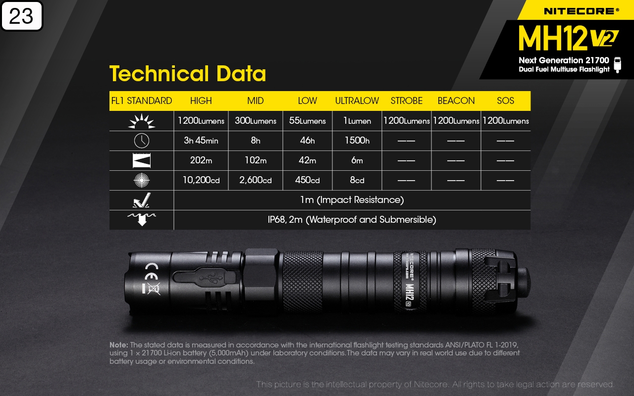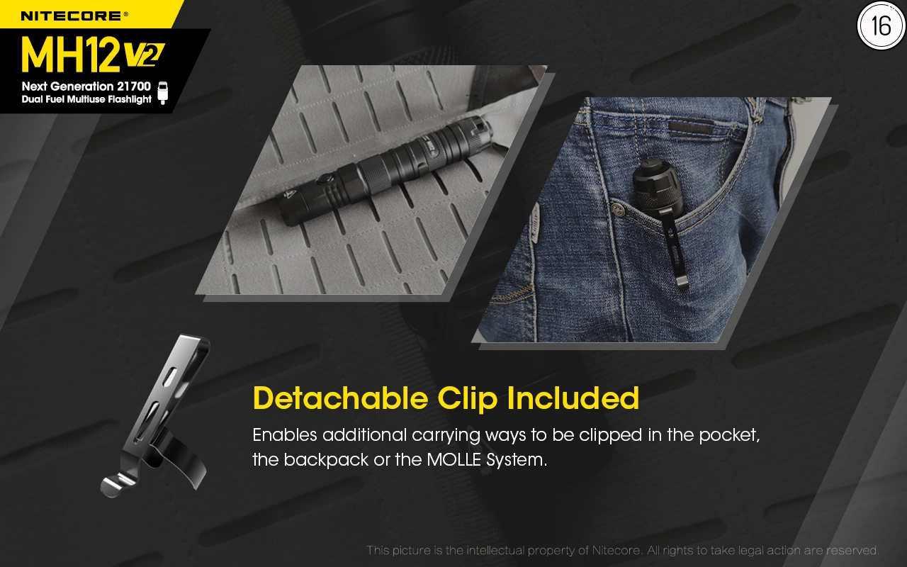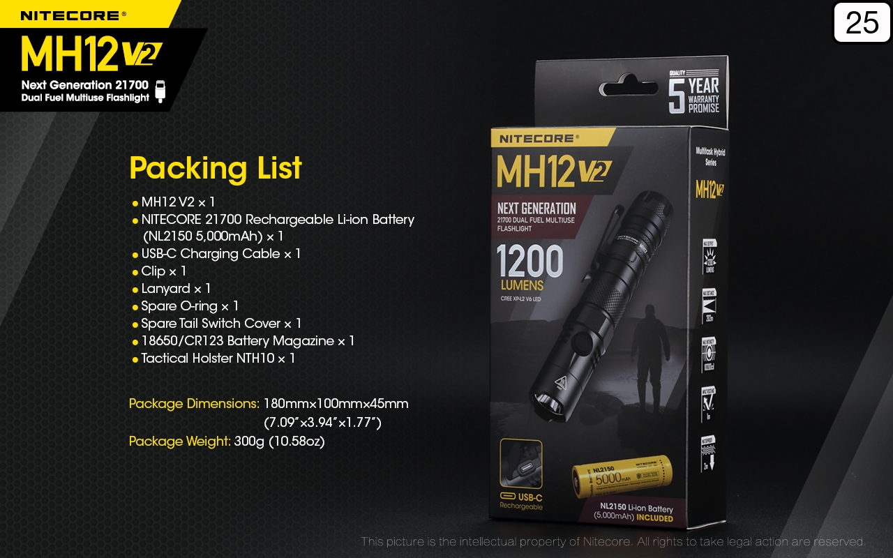 Περιεχόμενα συσκευασίας: 1 x Φακός NITECORE MH12 V2, 1 x Επαναφορτιζόμενη μπαταρία Li-ion NITECORE 21700 (NL2150 / 5000mAh), 1 x Καλώδιο φόρτισης USB-C, 1 x Ατσάλινο κλιπ ανάρτησης, 1 x Λουράκι καρπού, 1 x Ανταλλακτικός ελαστικός δακτύλιος, 1 x Αντάπτορας για χρήση μπαταριών 18650 ή CR123, 1 x Επιχειρησιακή σκληρή θήκη ζώνης NTH10.