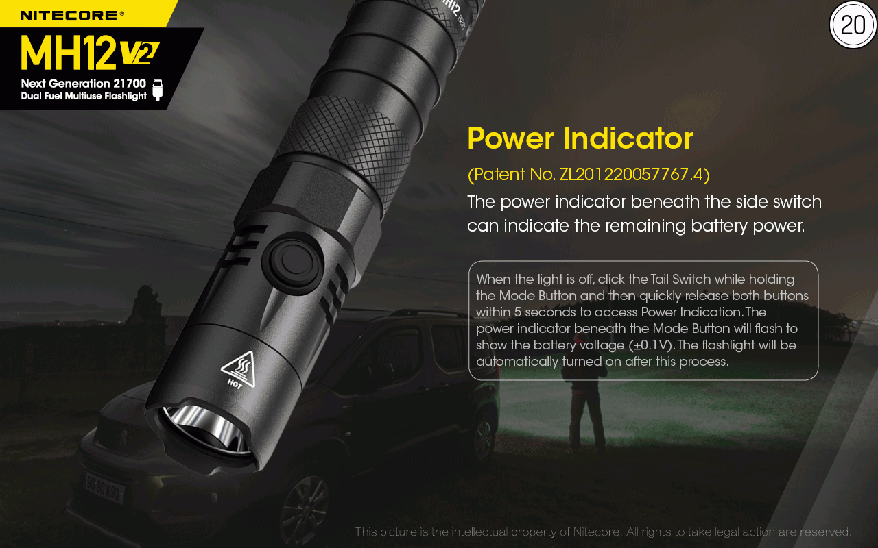 Διαθέτει ενδεικτική λυχνία ισχύς κάτω από τον πλάγιο διακόπτη, που καταδεικνύει την ενέργεια που έχει απομείνει στην μπαταρία, η μέτρηση της μπαταρίας γίνεται με ακρίβεια ±0,1V. Το ηλεκτρονικό του κύκλωμα είναι υψηλής απόδοσης και εξασφαλίζει σταθερή φωτεινή δέσμη χωρίς αναβοσβήματα για μία άνετη οπτική εμπειρία. Είναι βαθμολογημένος με IP68, αδιάβροχος έως και 2 μέτρα βάθος και με αντοχή στις πτώσεις έως και από 1 μέτρο ύψος.