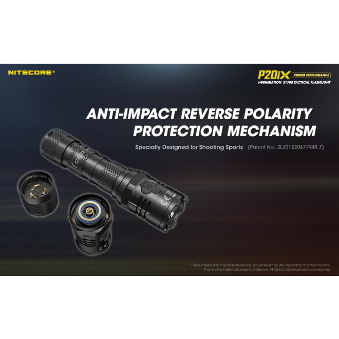 Διαθέτει ενδεικτική λυχνία ενέργειας (Ευρεσιτεχνία με αριθμό ZL201220057767.4), όπου όταν η μπαταρία τοποθετείται στον φακό ή όταν ο φακός αποσυνδέεται από την φόρτιση, η ενδεικτική λυχνία θα αναβοσβήσει για να καταδείξει την τάση της μπαταρίας με ακρίβεια +/-0,1Volt. Με μηχανισμό προστασίας από πτώσεις και από ανάποδη πολικότητα, τον καθιστά κατάλληλο για αθλήματα σκοποβολής (Ευρεσιτεχνία με αριθμό ZL201220677948.7).