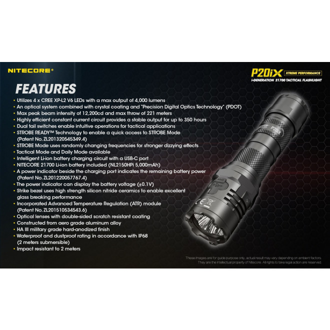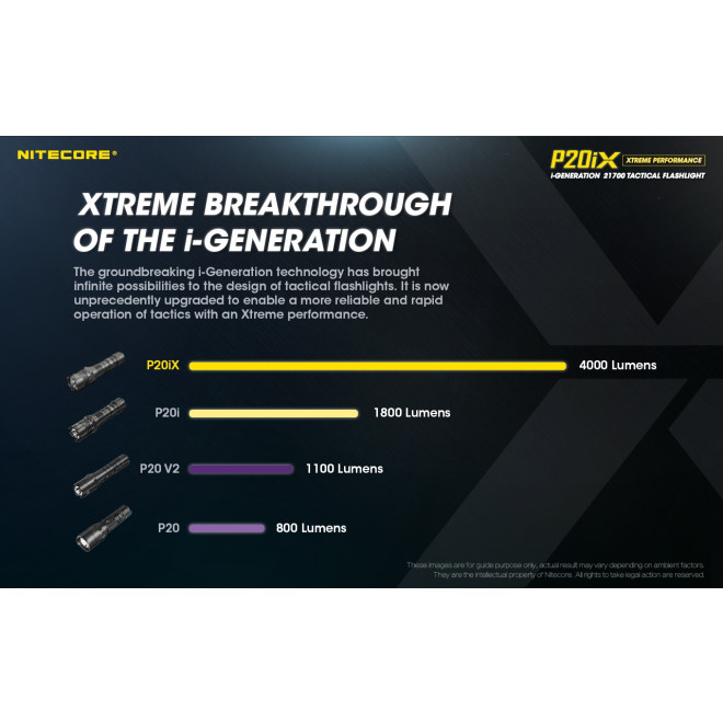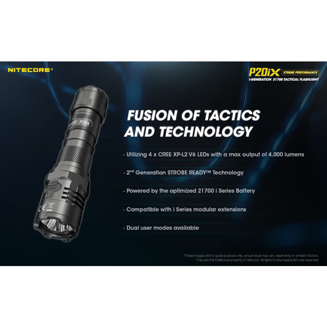 Η ένωση επιχειρησιακών χαρακτηριστικών και τεχνολογίας, ενσωματώνει 4 x LED CREE XP-L2 V6 με μέγιστη απόδοση 4000 Lumens, τεχνολογία άμεσου STROBE φωτισμού 2ης γενιάς, ενώ τροφοδοτείται από μία βελτιωμένη μπαταρία 21700 της σειράς " i " και είναι συμβατός με τις προεκτάσεις για τους φακούς " i " καθώς διαθέτει δύο λειτουργίες που επιλέγονται από τον χρήστη.