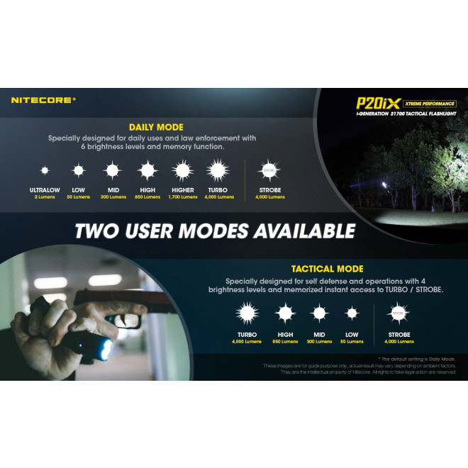Διαθέτει δύο τρόπους λειτουργίας που μπορεί να επιλέξει ο χρήστης, τον καθημερινό τρόπο λειτουργίας, οποίος είναι ειδικά σχεδιασμένος για καθημερινή χρήση και για τα σώματα ασφαλείας με 6 επίπεδα φωτεινότητας και λειτουργία μνήμης: Πολύ χαμηλή 2 Lumens, Χαμηλή 50 Lum, Μεσαία 300 Lum, Υψηλή 850 Lum, Υψηλότερη 1700 Lum, Turbo 4000 Lum και Strobe 4000 Lum. Η άλλη λειτουργία είναι ο επιχειρησιακός τρόπος λειτουργίας, ο οποίος είναι ειδικά σχεδιασμένος για αυτοάμυνα και επιχειρήσεις με τέσσερα επίπεδα φωτεινότητας και απομνημόνευση της στιγμιαίας ενεργοποίησης της φωτεινότητας: Turbo 4000 Lum, Υψηλή 850 Lum, Μεσαία 300 Lum, Χαμηλή 50 Lum, Strobe 4000 Lum.