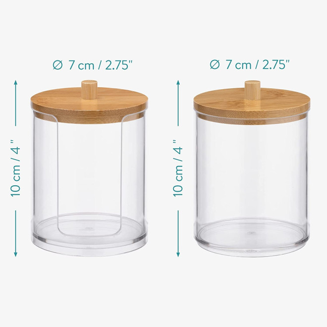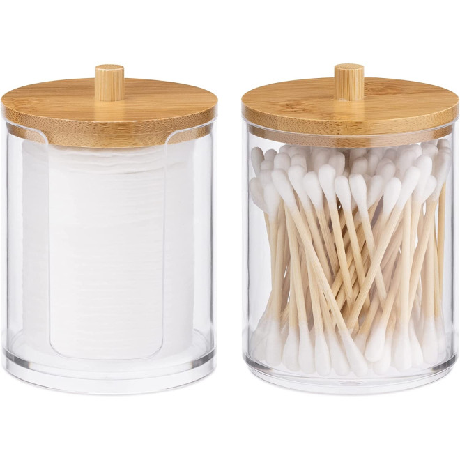 Τα δοχεία είναι επίσης κατάλληλα για την αποθήκευση δίσκων βαμβακιού, μπάλες από βαμβάκι και άλλα μικρά καλλυντικά μπάνιου και ομορφιάς. Ταιριάζουν υπέροχα στο μπάνιο σας ή στο μπουντουάρ στην κρεβατοκάμαρά σας. Κάθε δοχείο διαθέτει το δικό του καπάκι, κατασκευασμένο από γνήσιο μπαμπού, για μια έξυπνη λύση αποθήκευσης που φαίνεται υπέροχη στο μπάνιο ή την κρεβατοκάμαρά σας.