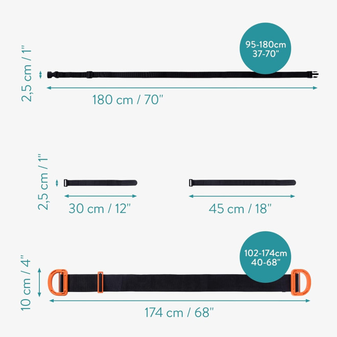Η συσκευασία περιλαμβάνει: 1 x Ρυθμιζόμενος ιμάντας με κλείσιμο 180 x 2.5cm, 1 x Ιμάντας με γάντζο και βρόγχο 30 x 2.5cm, 1 x Ιμάντας με γάντζο και βρόγχο 45 x 2.5cm, 2 x Ρυθμιζόμενοι ιμάντες μετακόμισης 174 x10 cm.