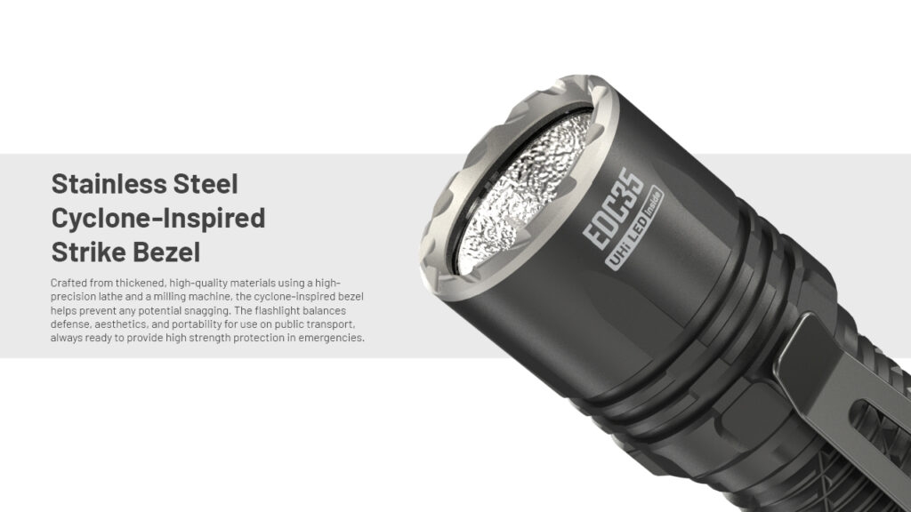 Ο δακτύλιος κρούσης Strike Bezel, είναι κατασκευασμένος από ανοξείδωτο ατσάλι και εμπνευσμένος από τον κυκλώνα! Κατασκευασμένη από παχύτερα, υψηλής ποιότητας υλικά, με τη χρήση τόρνου υψηλής ακρίβειας και φρέζας, η εμπνευσμένη στεφάνη από τον κυκλώνα, συμβάλλει στην αποφυγή οποιουδήποτε πιθανού σπασίματος. Ο φακός ισορροπεί την άμυνα, την αισθητική και τη φορητότητα για χρήση στα μέσα μαζικής μεταφοράς, πάντα έτοιμος να παρέχει προστασία υψηλής αντοχής σε καταστάσεις έκτακτης ανάγκης.
