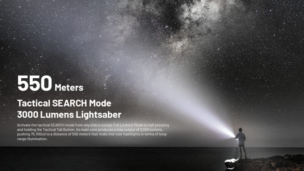 Επιπλέον, σας προσφέρει πολύ μεγάλη απόσταση κάλυψης στην λειτουργία επιχειρησιακής αναζήτησης, στα 550m! Ένα φωτόσπαθο 3000 Lumens! Ενεργοποιήστε τη λειτουργία επιχειρησιακής αναζήτησης από οποιαδήποτε κατάσταση, εκτός από τη λειτουργία πλήρους κλειδώματος, πατώντας τον διακόπτη ουράς έως το μέσον της διαδρομής του και κρατώντας τον εκεί πατημένο. Ο κύριος πυρήνας του παράγει μέγιστη ισχύ 3.000 lumens, σπρώχνοντας 75.700cd (κεριά) σε απόσταση 550 μέτρων!