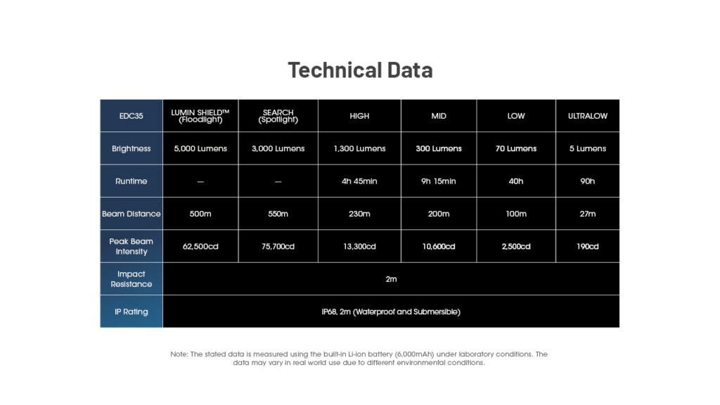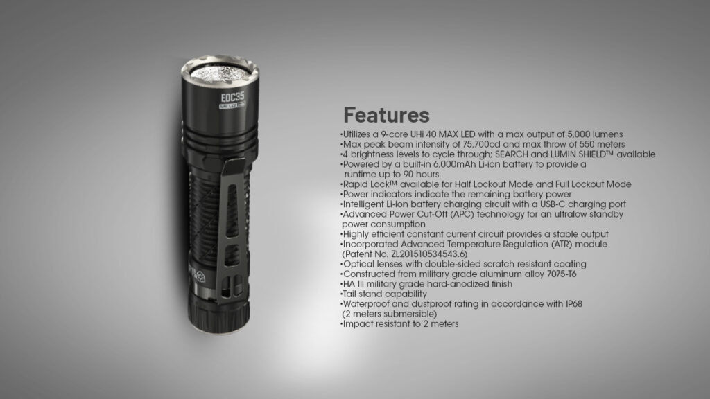 Ο επιχειρησιακός φακός καθημερινής χρήσης EDC35, Every-Day Carry της Nitecore, φθάνει τον φωτισμό στα άκρα και διαθέτει τέσσερις καινοτομίες που παρουσιάζονται σε παγκόσμιο επίπεδο πρώτη φορά! Έρχεται με κορυφαία απόδοση με την νέα LED UHi40 MAX, με τους εννέα πυρήνες, απρόσκοπτη λειτουργία με το σύστημα Rapid Lock™ για γρήγορο κλείδωμα, άμεση άμυνα με την λειτουργία Lumin Shield™ 5000-Lumens για ενισχυμένη προστασία και πολύ μεγάλη χωρητικότητα, όπου ενσωματώνει την μεγαλύτερη μπαταρία 21700 με 6000mAh.