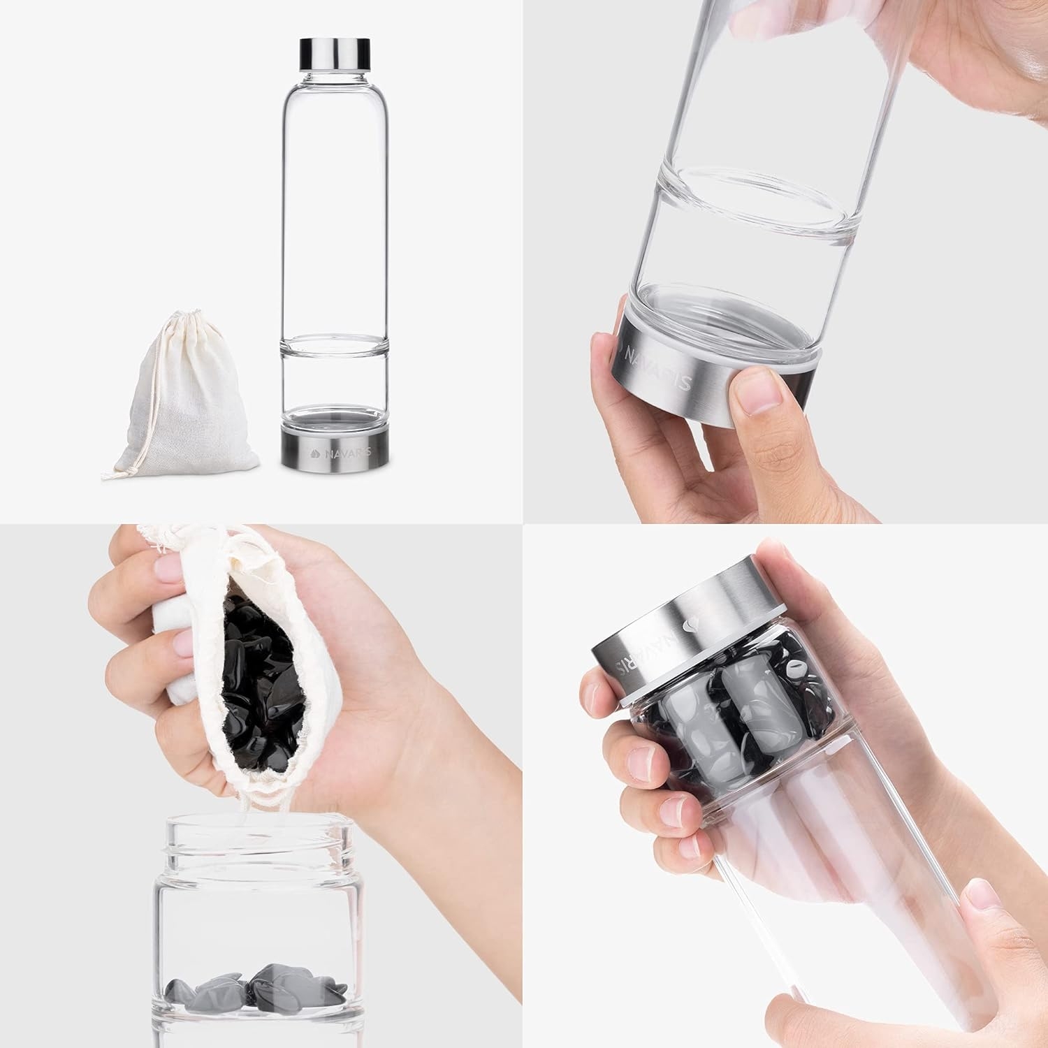 Είτε στο σπίτι, στο γραφείο, στο σχολείο ή στο γυμναστήριο, αυτό το επαναχρησιμοποιήσιμο γυάλινο μπουκάλι νερού, σας επιτρέπει να απολαμβάνετε νερό οπουδήποτε. Η επεξεργασία νερού με πολύτιμους λίθους φέρνει γαλήνη και σας βοηθά να ανακουφίσετε το στρες και το άγχος.