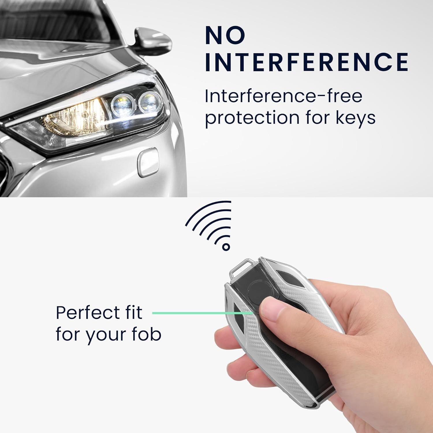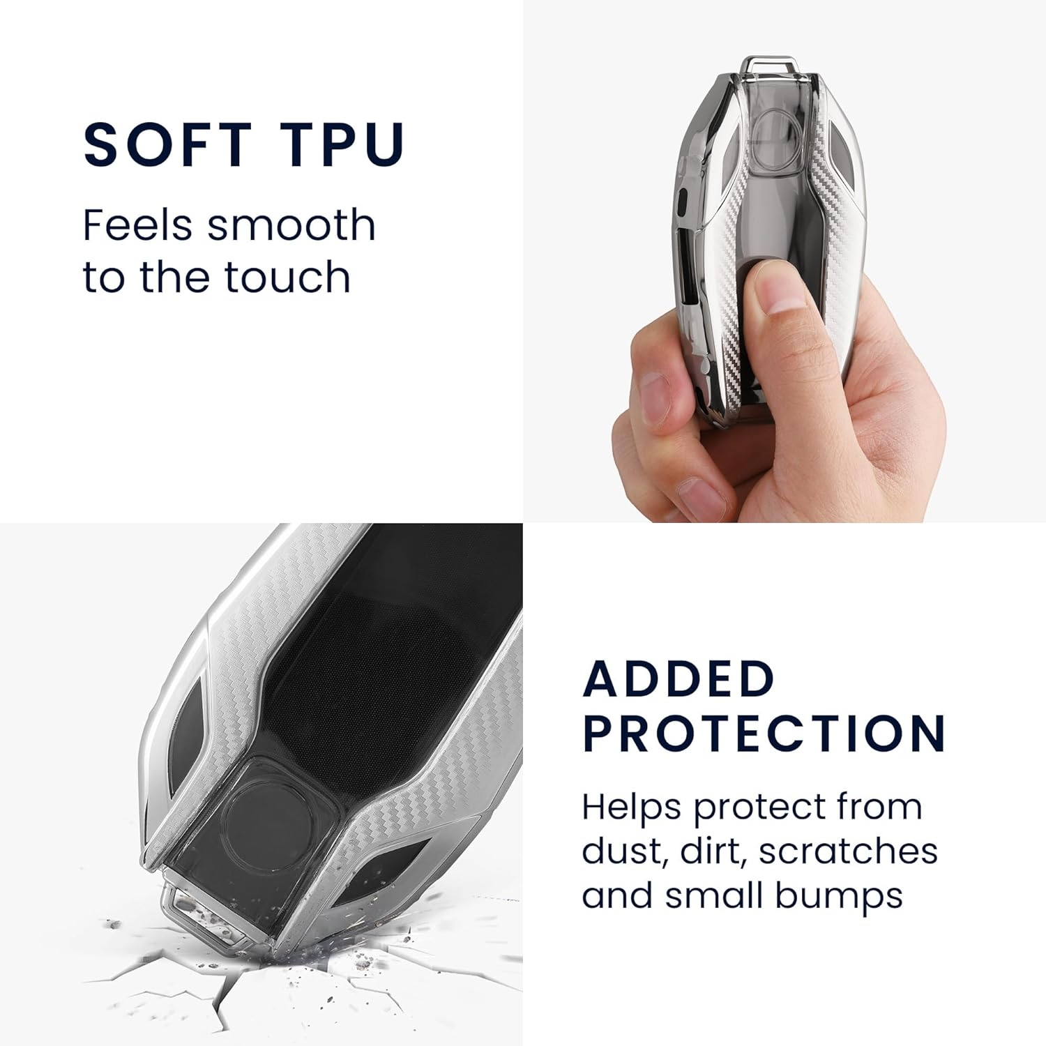 Το υλικό TPU υψηλής ποιότητας προσφέρει άνετη εφαρμογή και απαλή αίσθηση στην αφή, ενώ το σχέδιο από άνθρακα γύρω από τα κουμπιά και οι ρίγες στο πίσω μέρος προσθέτουν στυλ και επιπλέον προστασία. Ειδικά σχεδιασμένη για να ταιριάζει απόλυτα στο μοντέλο του κλειδιού του αυτοκινήτου σας, αυτή η θήκη τοποθετείται εύκολα χωρίς εργαλεία, προσφέροντας προστασία χωρίς παρεμβολές.