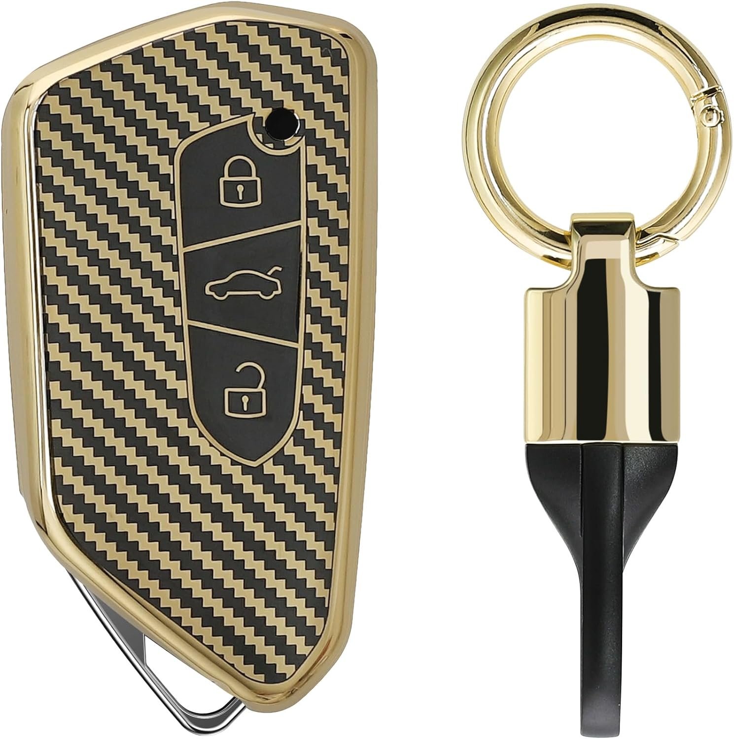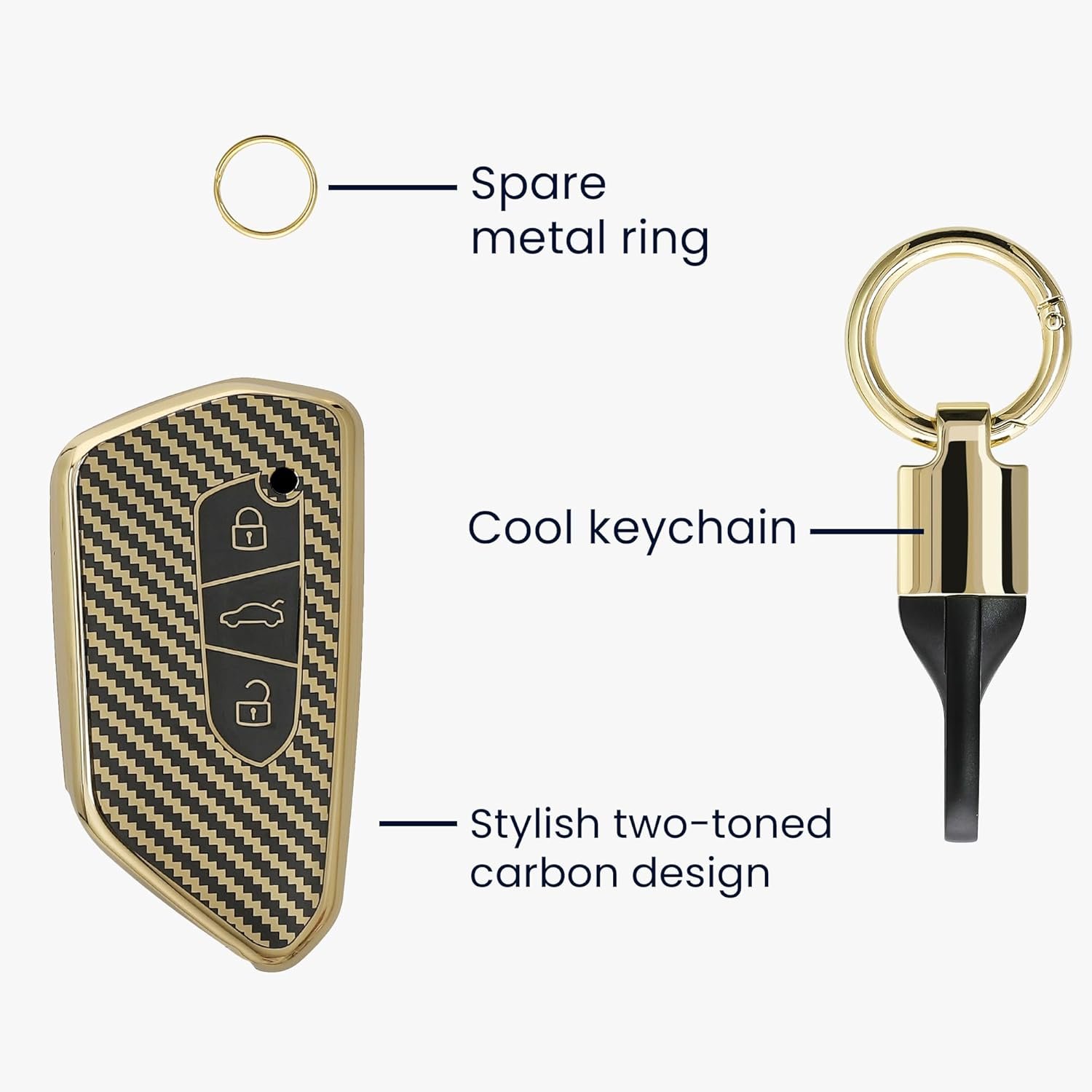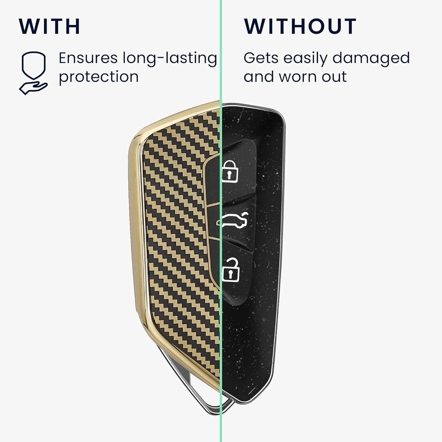 H θήκη κλειδιού αυτοκινήτου της KW σε χρώμα Metallic Carbon Fiber / Gold / Black είναι ειδικά σχεδιασμένη για την προστασία του κλειδιού του αγαπημένου σας Volkswagen / Skoda / Seat / Cupra!