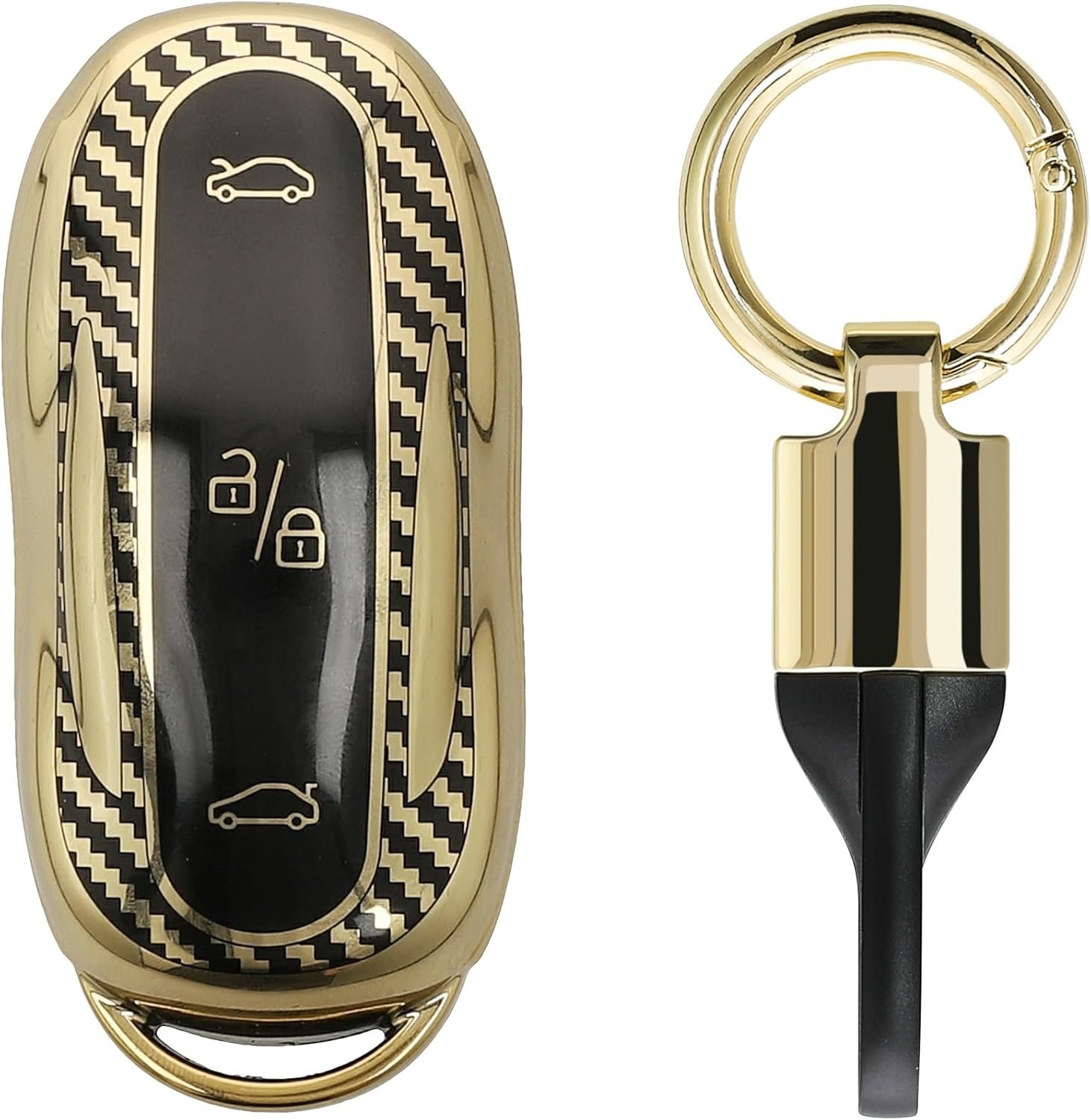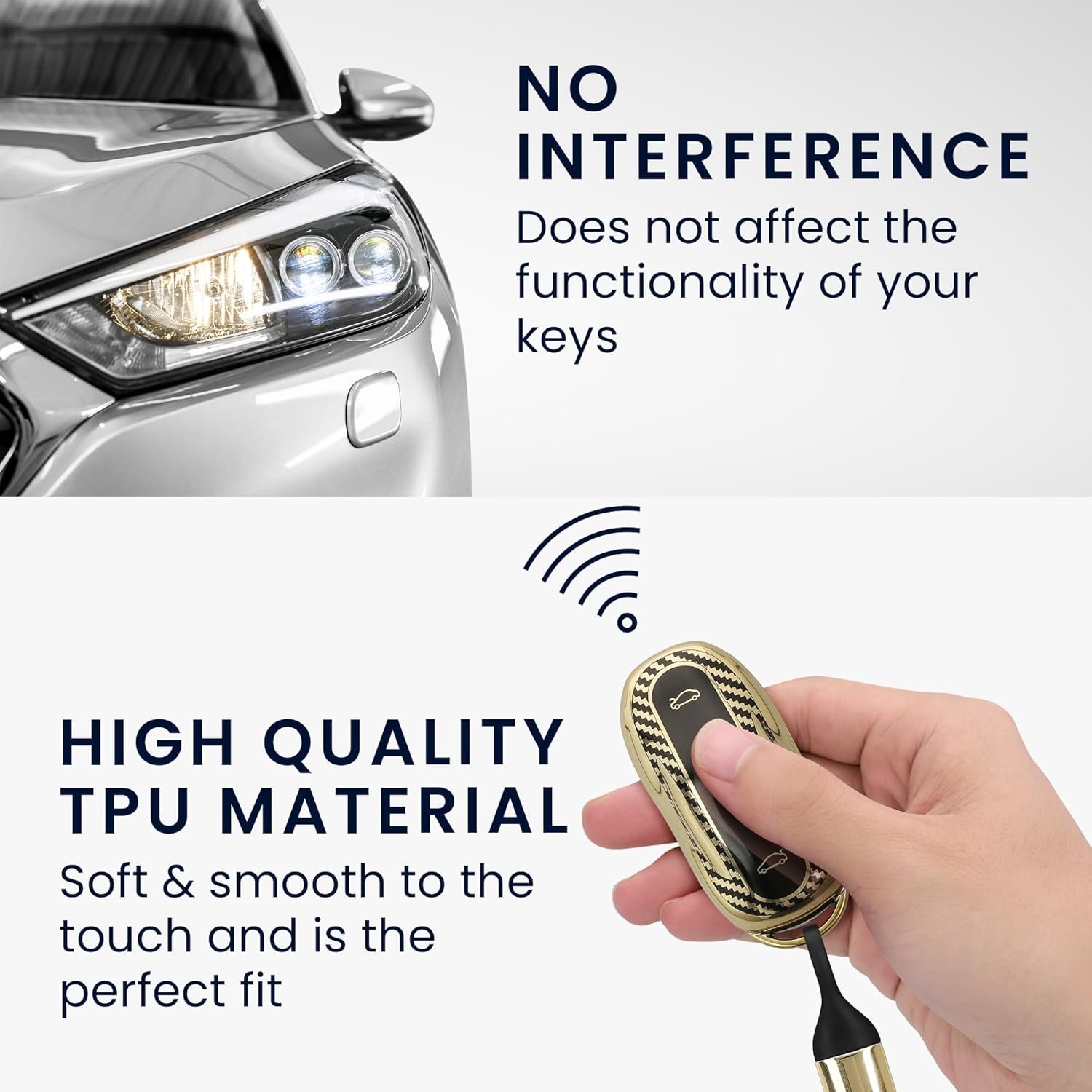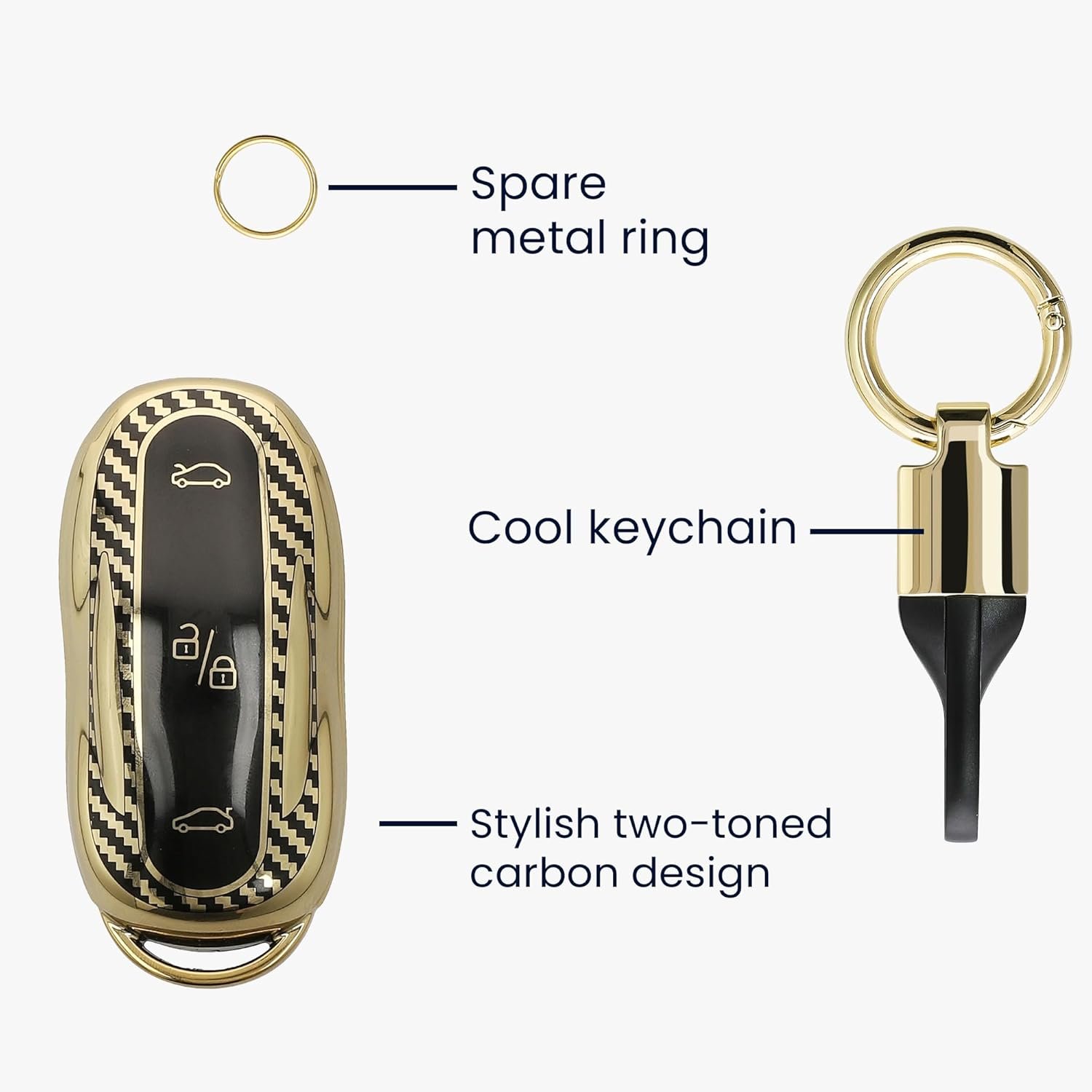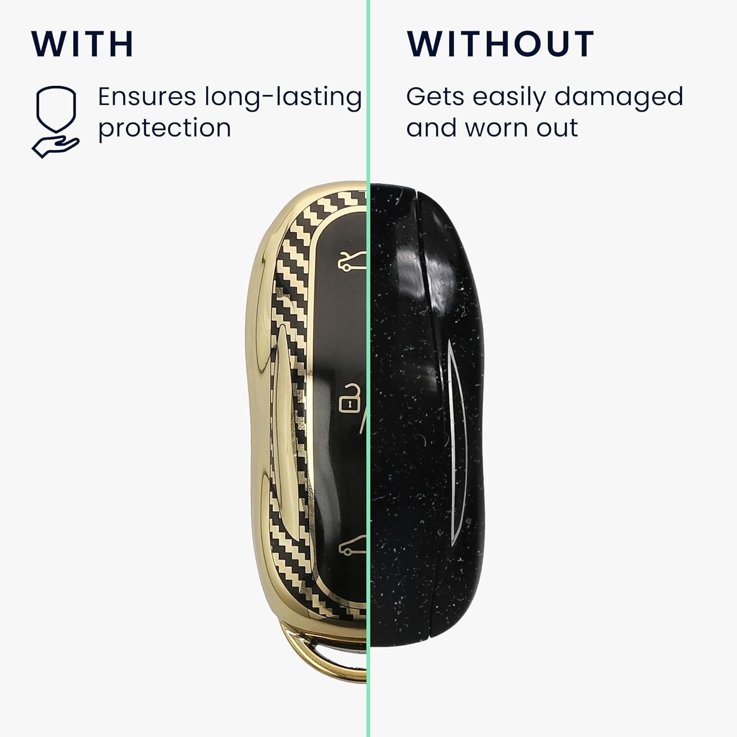 H θήκη κλειδιού αυτοκινήτου της KW σε χρώμα Metallic Carbon Fiber / Gold / Black είναι ειδικά σχεδιασμένη για την προστασία του κλειδιού του αγαπημένου σας Tesla!