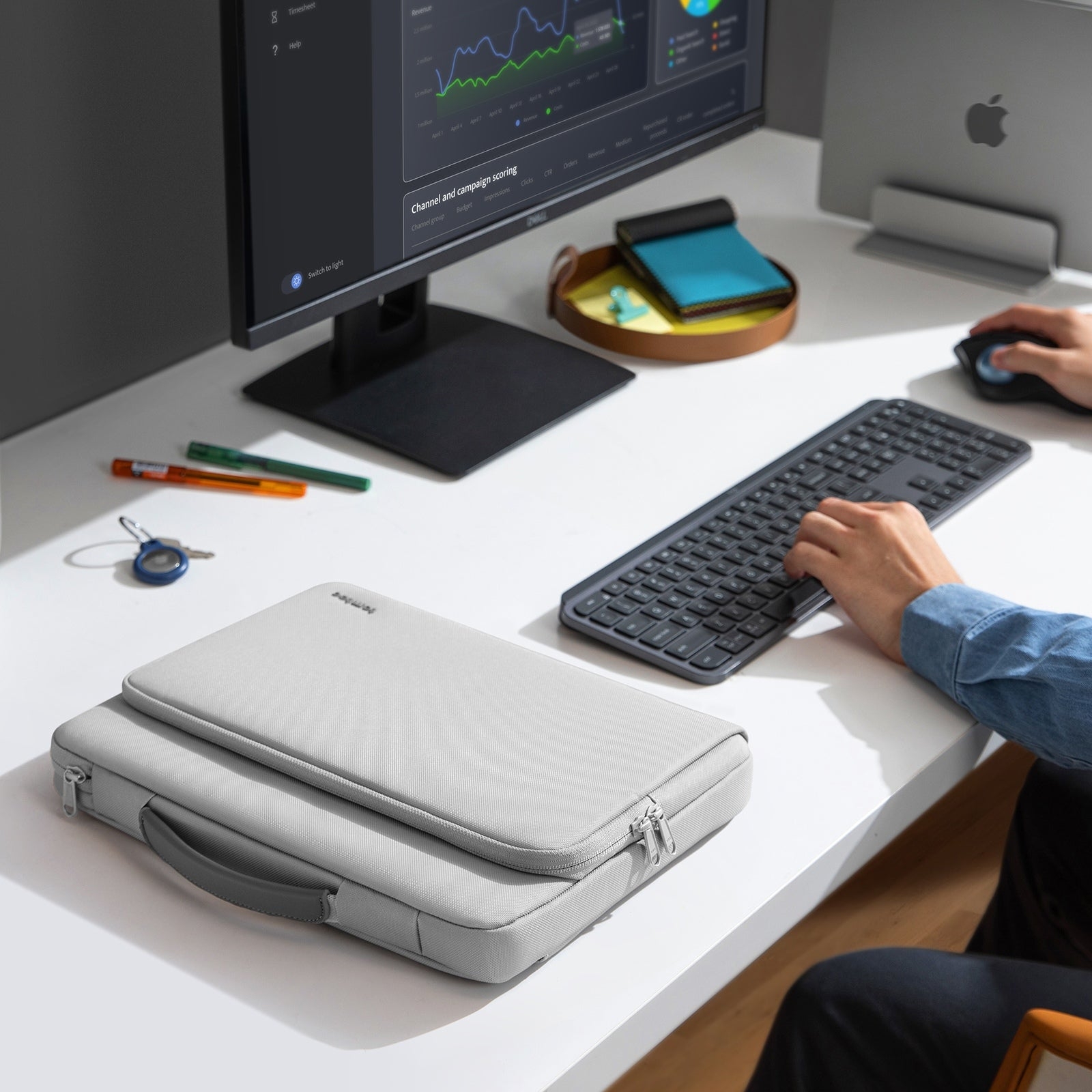 Διαθέτει μία μπροστινή θήκη με τσέπες εσωτερικά για αξεσουάρ φορητών υπολογιστών, όπως φορτιστές, φορητό ποντίκι, καλώδια, iPad και άλλα. Η παχιά επένδυση στο κάτω μέρος προστατεύει την τσάντα από μία πιθανή πτώση, ενώ η ανθεκτική εσωτερική μαλακή επένδυση αποτρέπει τις γρατσουνιές.