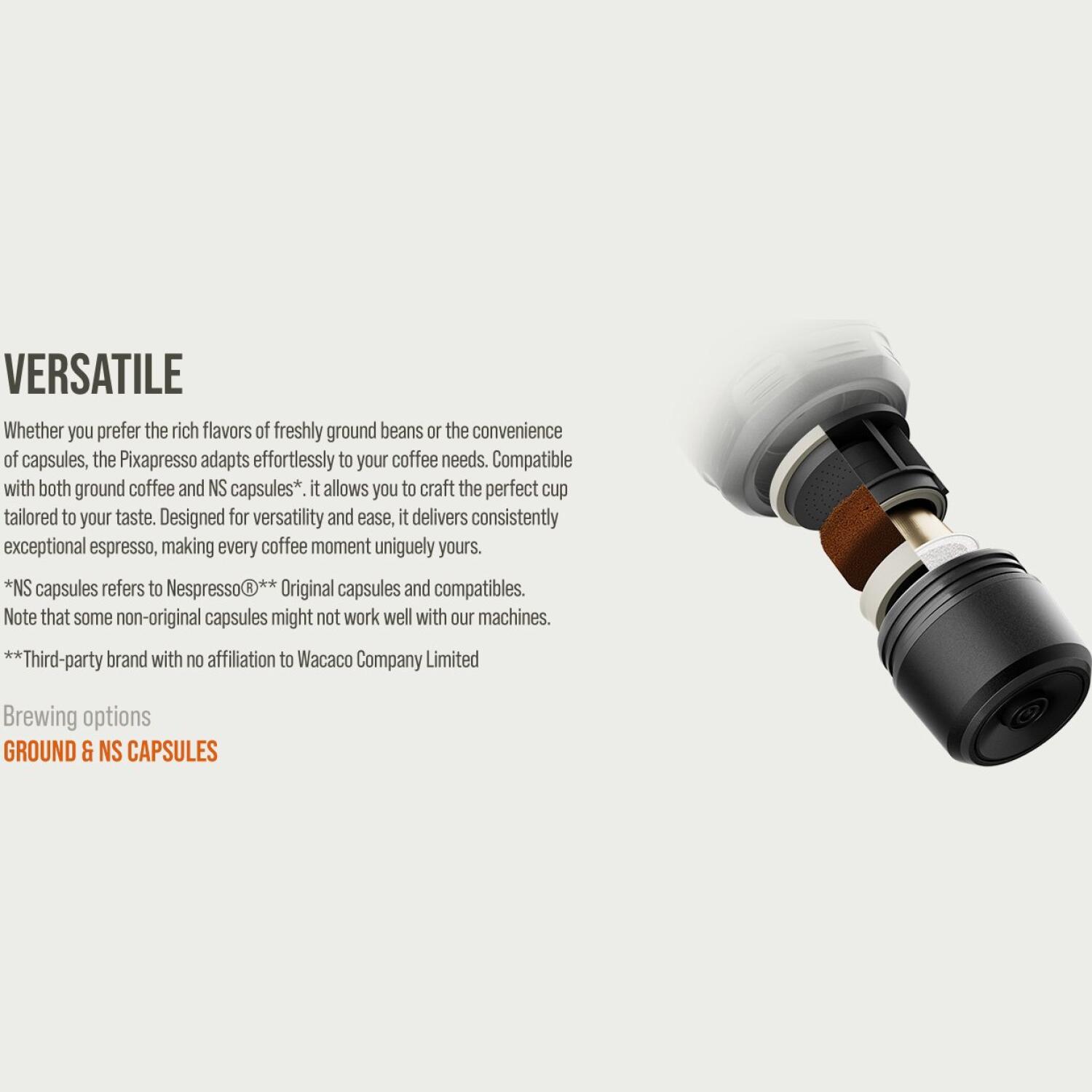 Με αντλία 20 bar, δημιουργεί έναν πλούσιο, βελούδινο εσπρέσο, είτε με φρεσκοαλεσμένο καφέ 8–16 γρ., είτε με κάψουλες Nespresso. Παρά το μικρό της μέγεθος, η Pixapresso διαθέτει δεξαμενή νερού 120 ml, προσφέροντας ristretto, espresso, διπλό espresso ή lungo, ανάλογα με τη διάθεσή σας. Είναι ιδανική για το σπίτι, το γραφείο ή τα ταξίδια σας.