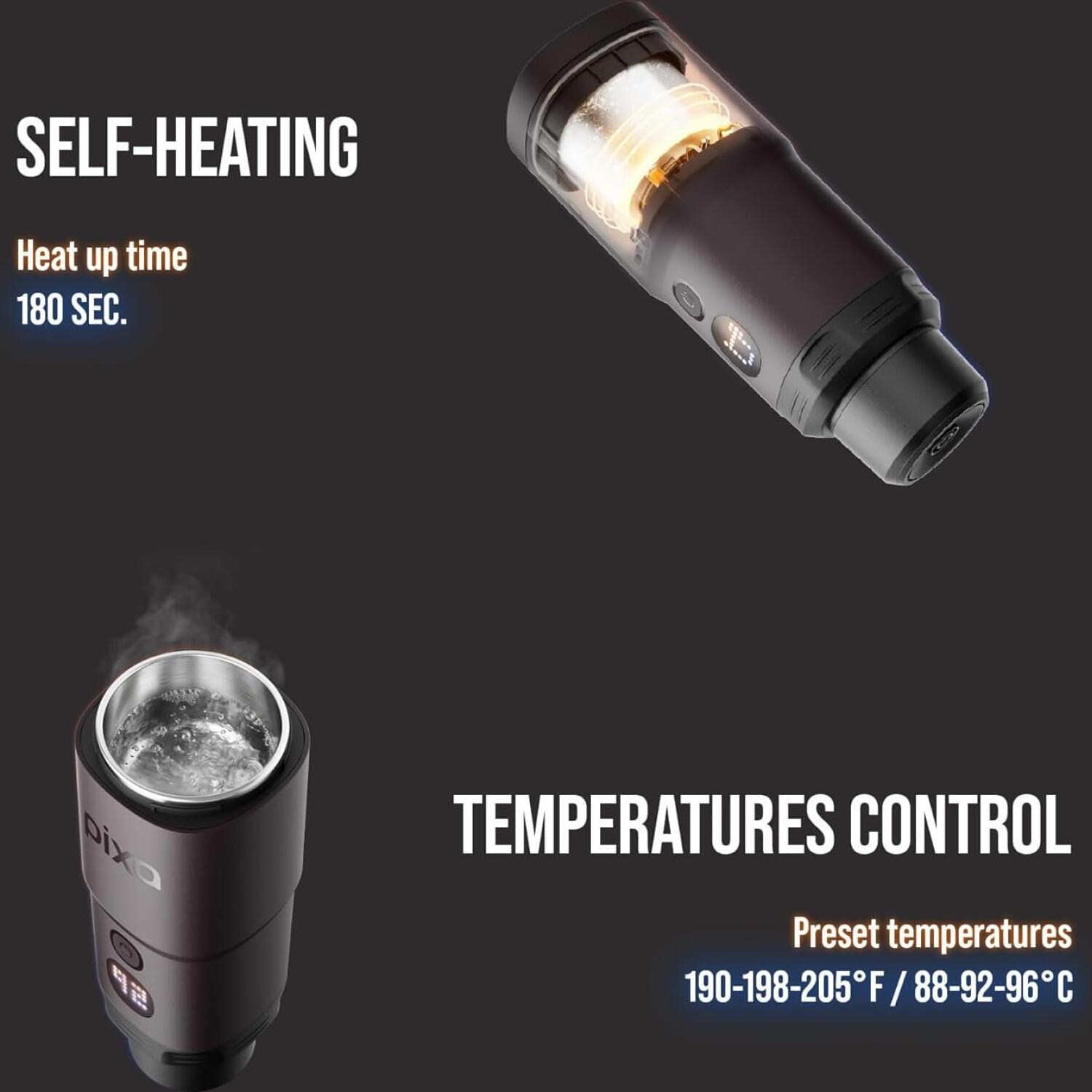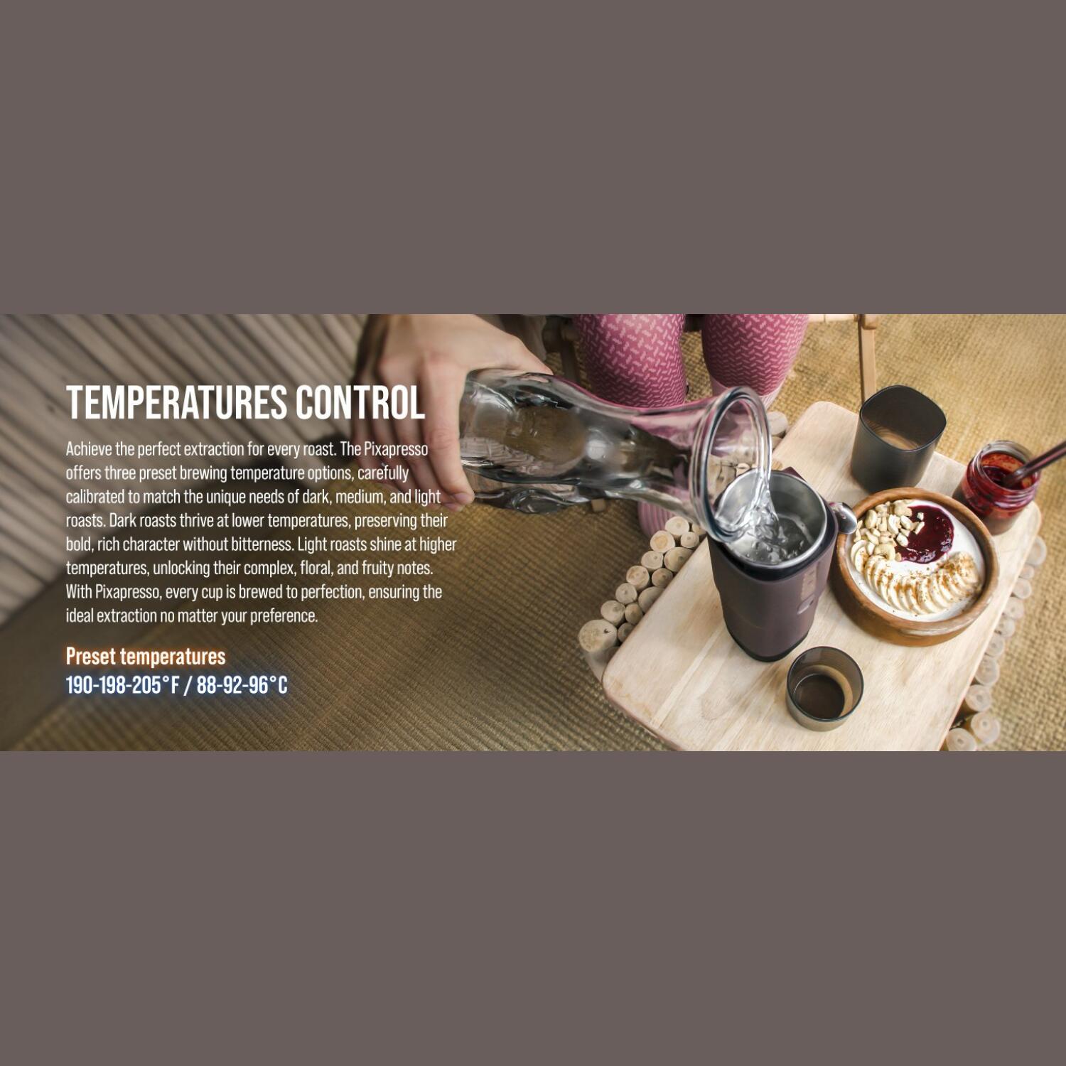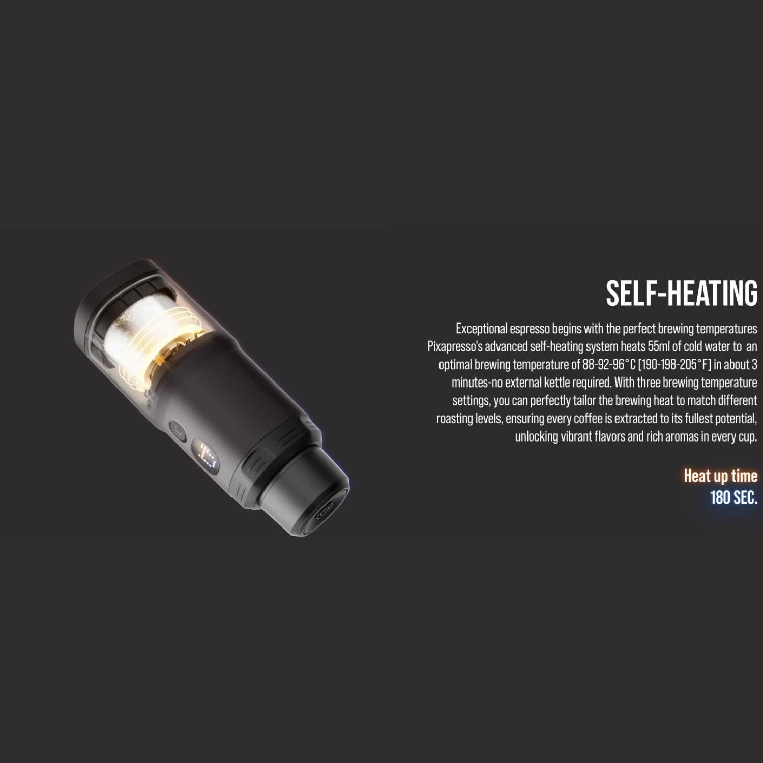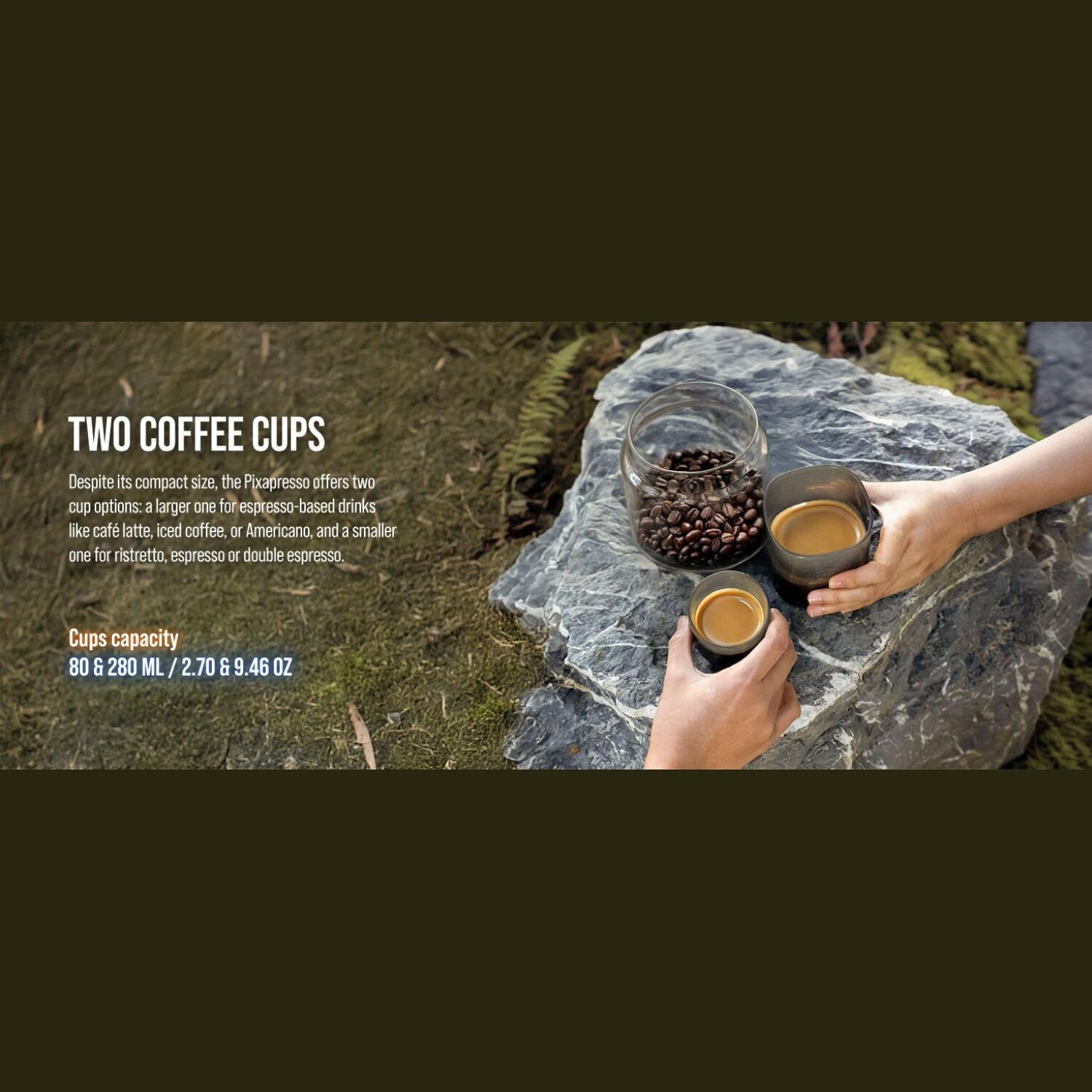 Είτε απολαμβάνετε καφέ κάτω από τα αστέρια σε μια εκδρομή, είτε κάνετε ένα διάλειμμα στο γραφείο, η Pixapresso σας προσφέρει κάθε φορά τον ζεστό καφέ που αγαπάτε. Με το πάτημα ενός κουμπιού θερμαίνει και εκχυλίζει τον espresso, ενώ μπορείτε να ενεργοποιήσετε ή να απενεργοποιήσετε τον ήχο, ανάλογα με το περιβάλλον σας. Επίσης, οι χαραγμένες με λέιζερ ενδείξεις σας επιτρέπουν να μετράτε με ακρίβεια την ποσότητα νερού που χρειάζεστε.