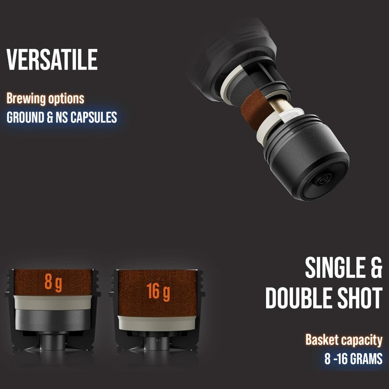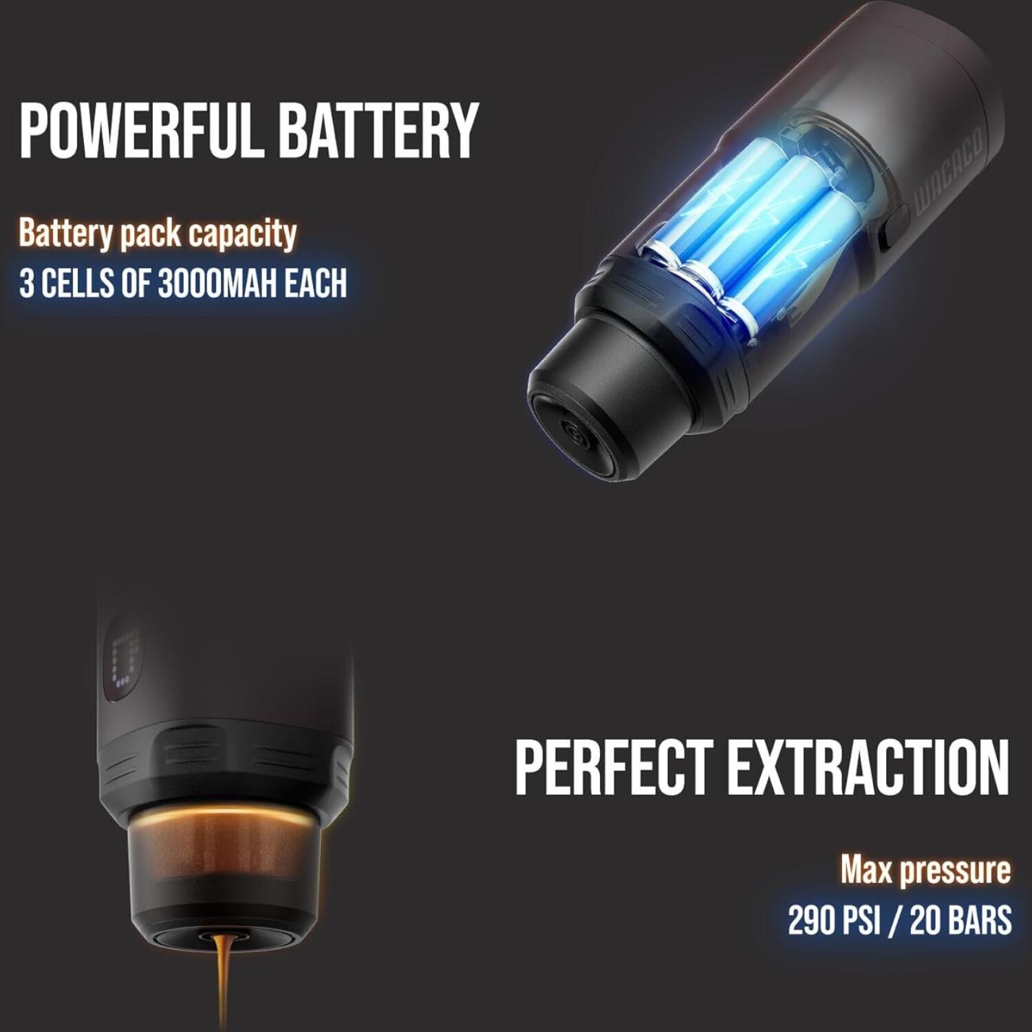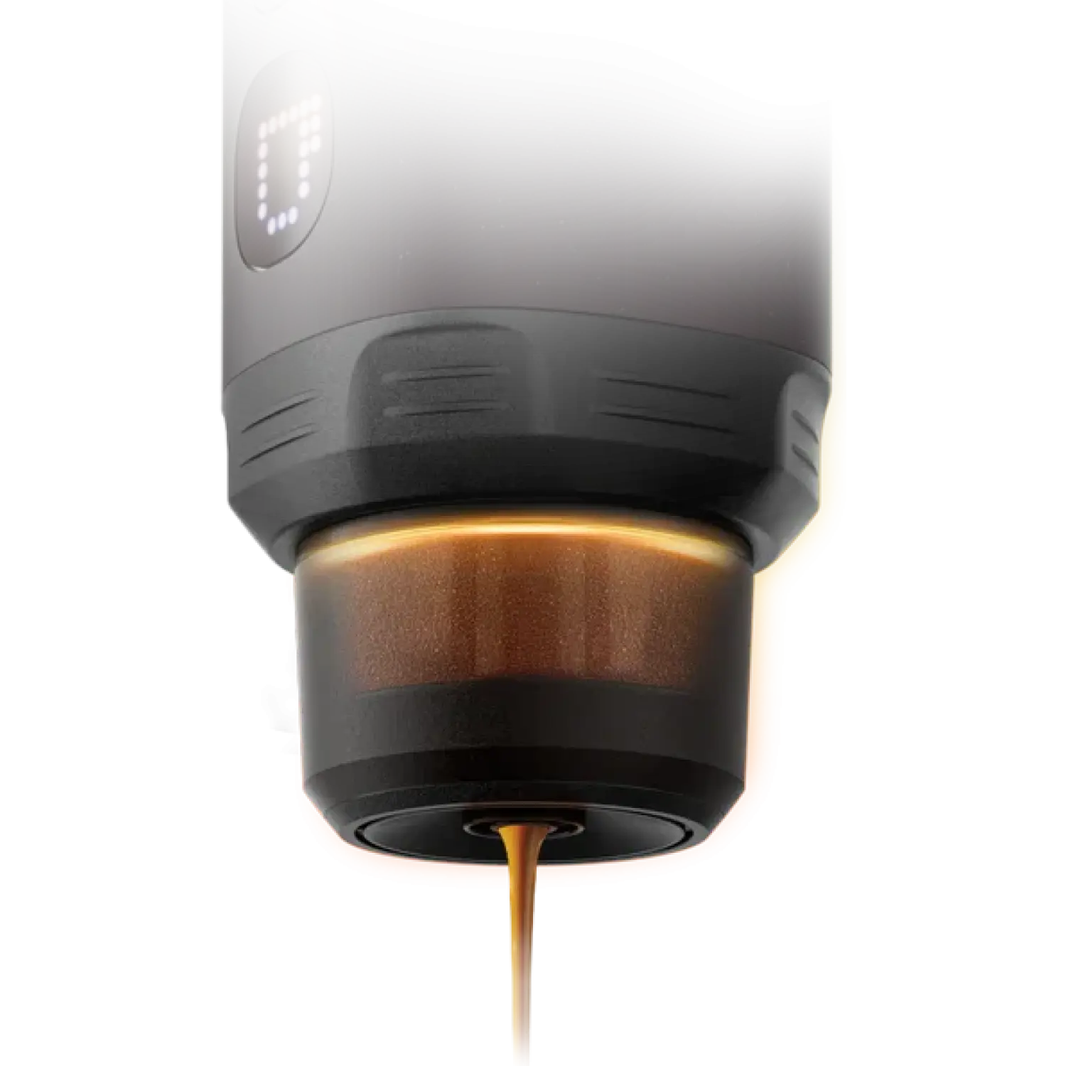 Με κομψό γαλλικό design, 3 μπαταρίες των 3000mAh η καθεμία, για παρασκευή έως και 5 εσπρέσο και ψηφιακή οθόνη αφής dot-matrix, η οποία σας επιτρέπει να ελέγχετε εύκολα βασικές ρυθμίσεις παρασκευής, όπως τη θερμοκρασία του ζεστού νερού, την προέγχυση ή την ένταση του όγκου, φέρνει την εμπειρία ενός barista στην παλάμη σας. Η ευρύχωρη, ανθεκτική δεξαμενή από ανοξείδωτο ατσάλι, είναι αρκετά μεγάλη ώστε να ετοιμάσετε έναν lungo ή δύο εσπρέσο.