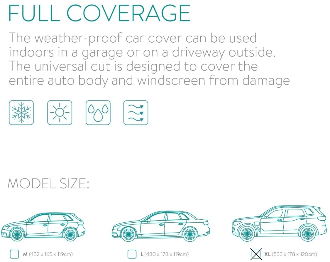 Προστατέψτε το αγαπημένο σας αυτοκίνητο από όλες τις καιρικές συνθήκες με αυτό το πρακτικό κάλυμμα της Navaris. Με αυτή τη μοναδική κουκούλα αυτοκινήτου, προστατεύετε το αυτοκίνητό σας από χαλάζι, βροχή, σκόνη, γύρη ή χιόνι.