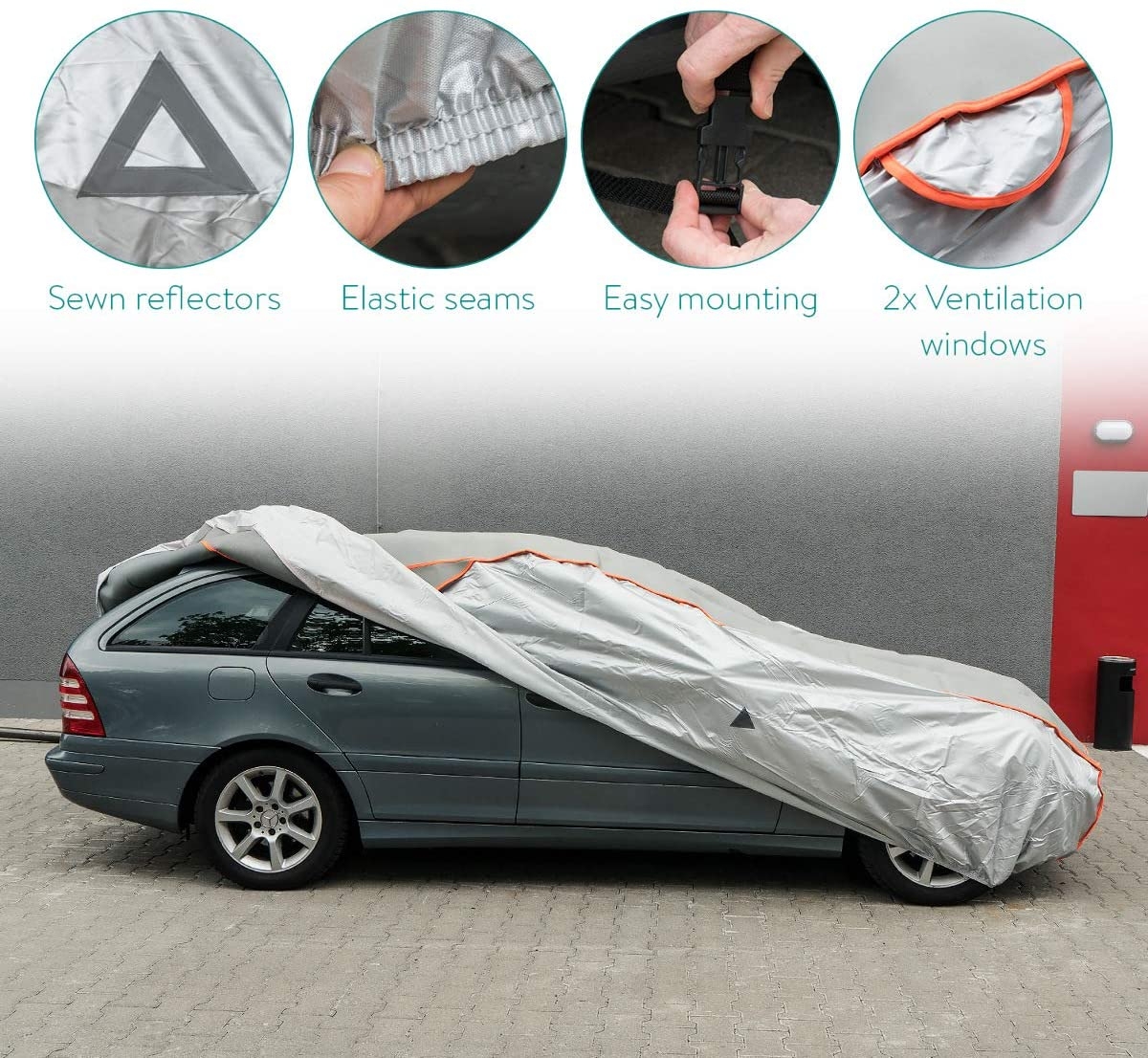 Χάρη στο ελαστικό του στρίφωμα και κλιπ, το κάλυμμα τοποθετείται γρήγορα και με ασφάλεια στο αυτοκίνητό σας. Εκτός από το κάλυμμα του αυτοκινήτου, θα λάβετε μια τσάντα αποθήκευσης για εξοικονόμηση χώρου και για εύκολη μεταφορά. Επιπλέον, διαθέτει ραμμένους ανακλαστήρες που αυξάνουν την ορατότητα τη νύχτα.