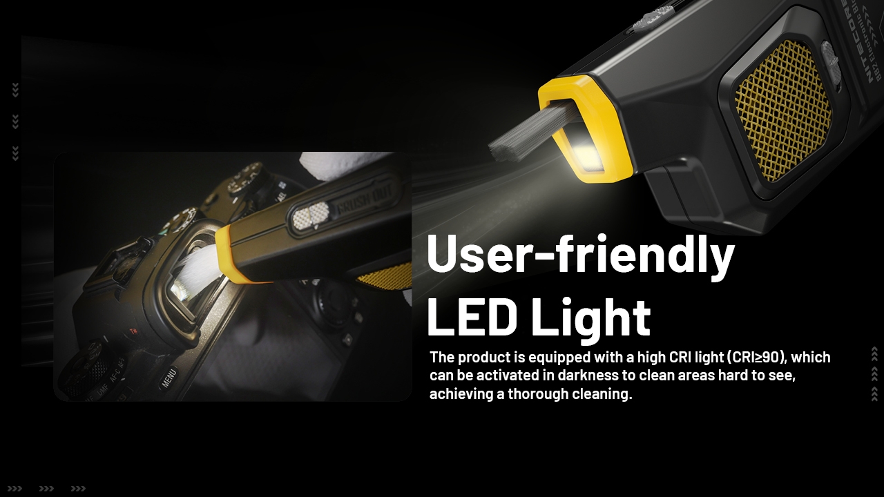 Η συσκευή είναι εφοδιασμένη με ένα υψηλού CRi φωτιστικό LED (CRi>90) που μπορεί να ενεργοποιηθεί στο σκοτάδι και να καθαριστούν περιοχές που είναι δύσκολο να φανούν, έτσι ώστε να επιτυγχάνεται πάντα ένας λεπτομερείς καθαρισμός. Επιπλέον, διαθέτει δύο επιλογές για τον καθαρισμό των συσκευών. Ο γρήγορος καθαρισμός: Πιέστε και κρατήστε πατημένο το κομβίο ενεργοποίησης για να ξεκινήσει ο καθαρισμός. Απελευθερώστε το κομβίο ενεργοποίησης για τον τερματισμό. Και ο συνεχόμενος καθαρισμός: Πιέστε δύο φορές το κομβίο ενεργοποίησης για να ξεκινήσει ο καθαρισμός. Πιέστε σύντομα το κομβίο ενεργοποίησης για τον τερματισμό.