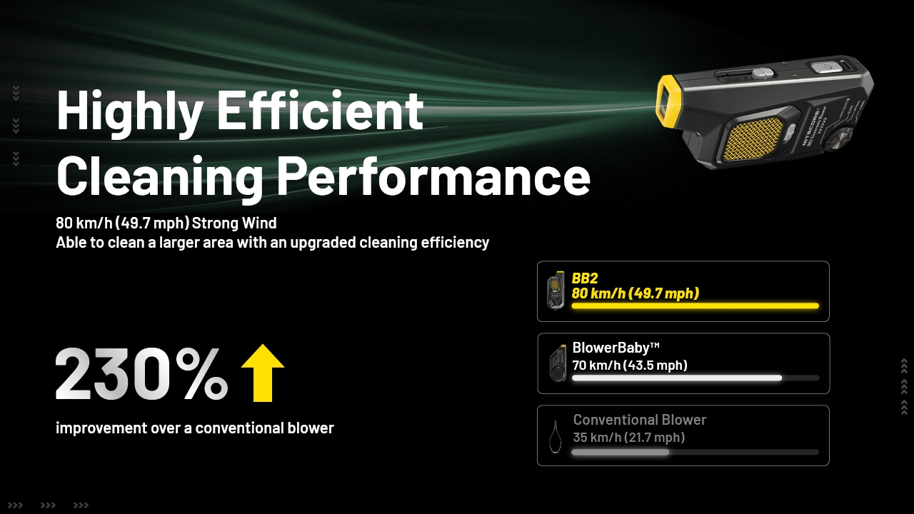 Η πίεση του αέρα για την αποβολή της σκόνης φθάνει τα 2,7kPa. Μία βελτιωμένη πίεση κατά 80% σε σχέση με άλλα μοντέλα. Ένας κοινός χειροκίνητος φυσητήρας έχει 1,5 kPa, ενώ το Nitecore BlowerBaby™ έχει 1 kPa. Προσφέρει εξαιρετικά αποδοτική επίδοση καθαρισμού ακόμα και σε μεγάλες επιφάνειες, με ισχυρό φύσημα αέρα με ταχύτητα 80Km/h, ικανό να καθαρίσει και μεγάλες επιφάνειες με βελτιωμένη απόδοση καθαρισμού. Δηλαδή έχει βελτιωμένη απόδοση καθαρισμού κατά 230% σε σχέση με τους κοινούς φυσητήρες.