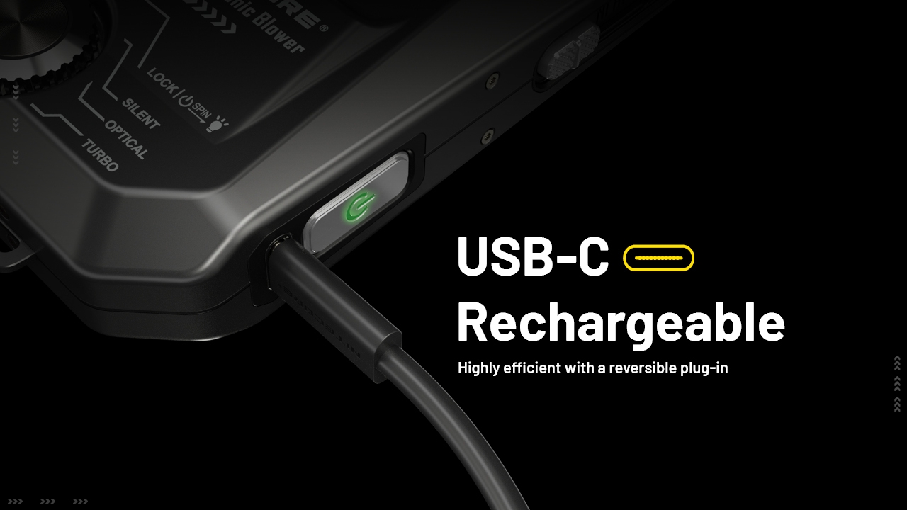 Το Blower Baby2 επαναφορτίζεται από τη θύρα Type-C, είναι μία εξαιρετικά αποδοτική λύση μιας και οι θύρες Type-C δεν απαιτούν φορά στην τοποθέτηση του καλωδίου. Έρχεται σε πολύ μικρό και φορητό μέγεθος, κάτι που διευκολύνει στην μεταφορά και την αποθήκευση, έτσι μπορεί να μεταφερθεί στην τσάντα σας αλλά και στην τσέπη.